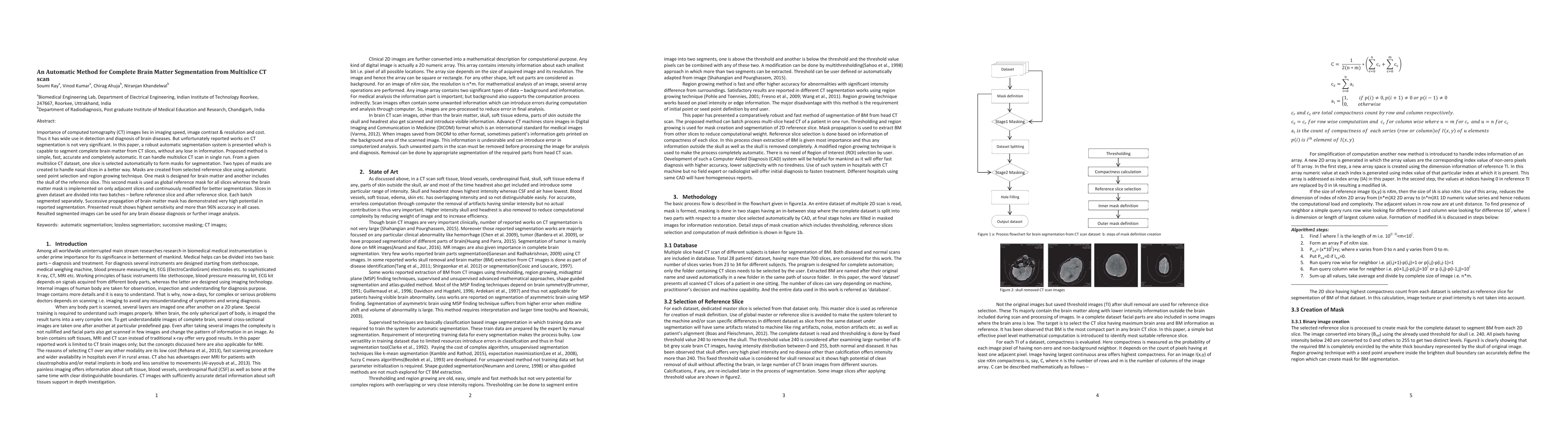 This paper introduces an automatic segmentation system for complete brain matter from multislice CT scans, utilizing seed point selection and region growing techniques to create masks. The method achieves high accuracy (over 96%) and is fully automatic, facilitating efficient brain disease diagnosis and further image analysis.