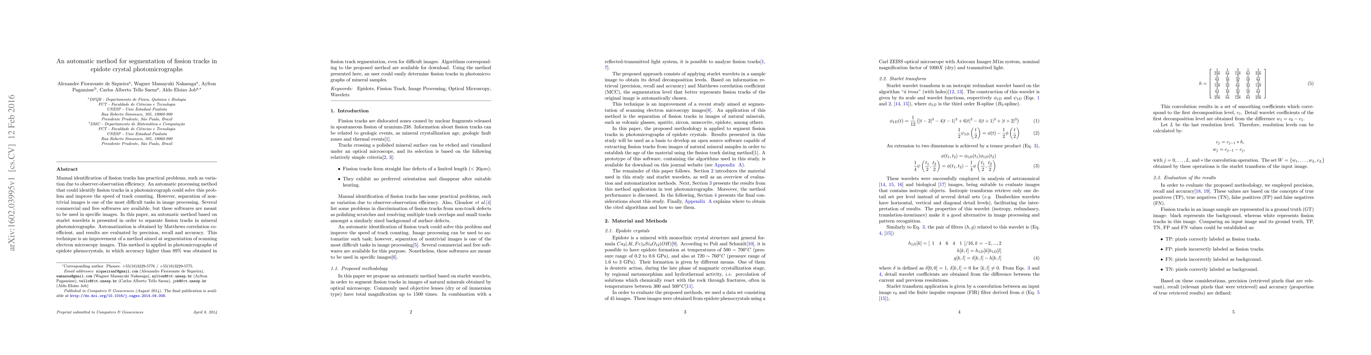 This paper introduces an automatic method using starlet wavelets and Matthews correlation coefficient to segment fission tracks in epidote crystal photomicrographs, achieving over 89% accuracy. The method improves upon existing techniques and offers downloadable algorithms for easy fission track identification in mineral samples.