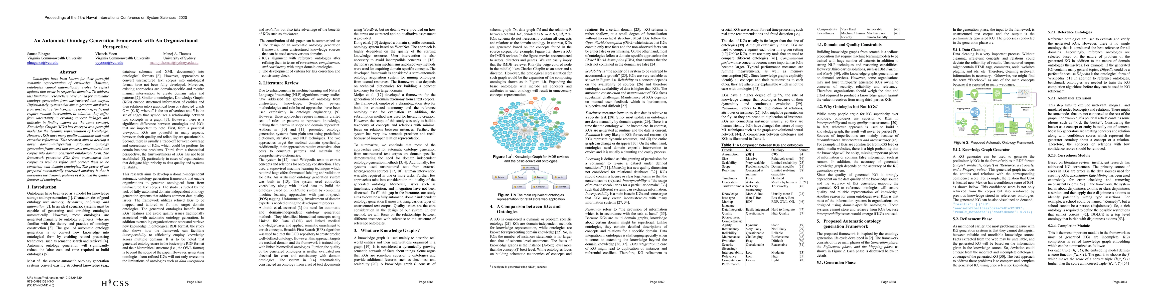 Ontologies have been known for their semantic representation of knowledge. ontologies cannot automatically evolve to reflect updates that occur in respective domains. To address this limitation, researchers have called for automatic ontology generation from unstructured text corpus. Unfortunately, systems that aim to generate ontologies from unstructured text corpus are domain-specific and require manual intervention. In addition, they suffer from uncertainty in creating concept linkages and difficulty in finding axioms for the same concept. Knowledge Graphs (KGs) has emerged as a powerful model for the dynamic representation of knowledge. However, KGs have many quality limitations and need extensive refinement. This research aims to develop a novel domain-independent automatic ontology generation framework that converts unstructured text corpus into domain consistent ontological form. The framework generates KGs from unstructured text corpus as well as refine and correct them to be consistent with domain ontologies. The power of the proposed automatically generated ontology is that it integrates the dynamic features of KGs and the quality features of ontologies.