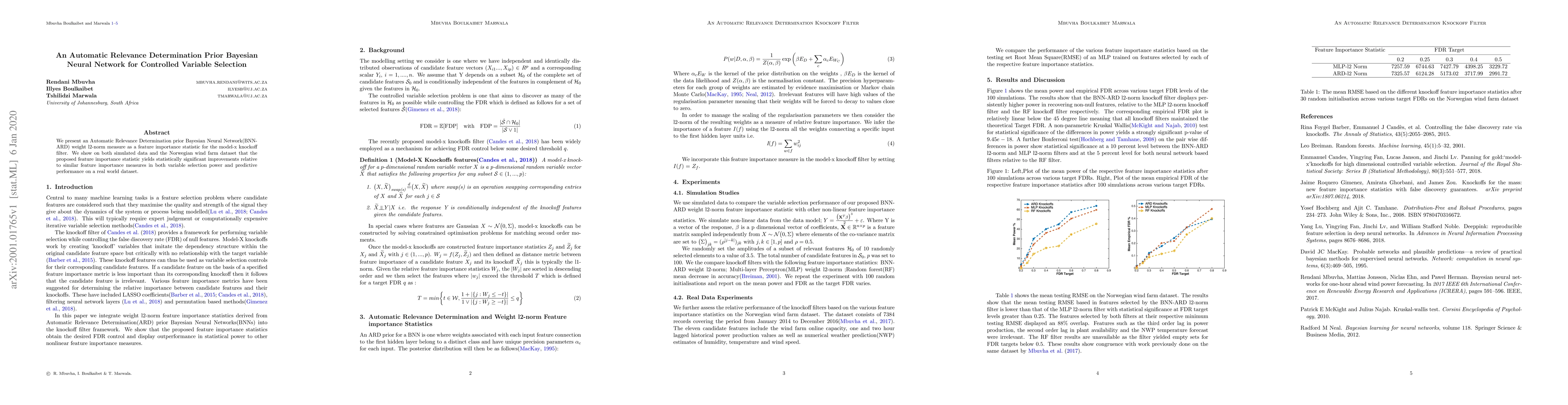 We present an Automatic Relevance Determination prior Bayesian Neural Network(BNN-ARD) weight l2-norm measure as a feature importance statistic for the model-x knockoff filter. We show on both simulated data and the Norwegian wind farm dataset that the proposed feature importance statistic yields statistically significant improvements relative to similar feature importance measures in both variable selection power and predictive performance on a real world dataset.