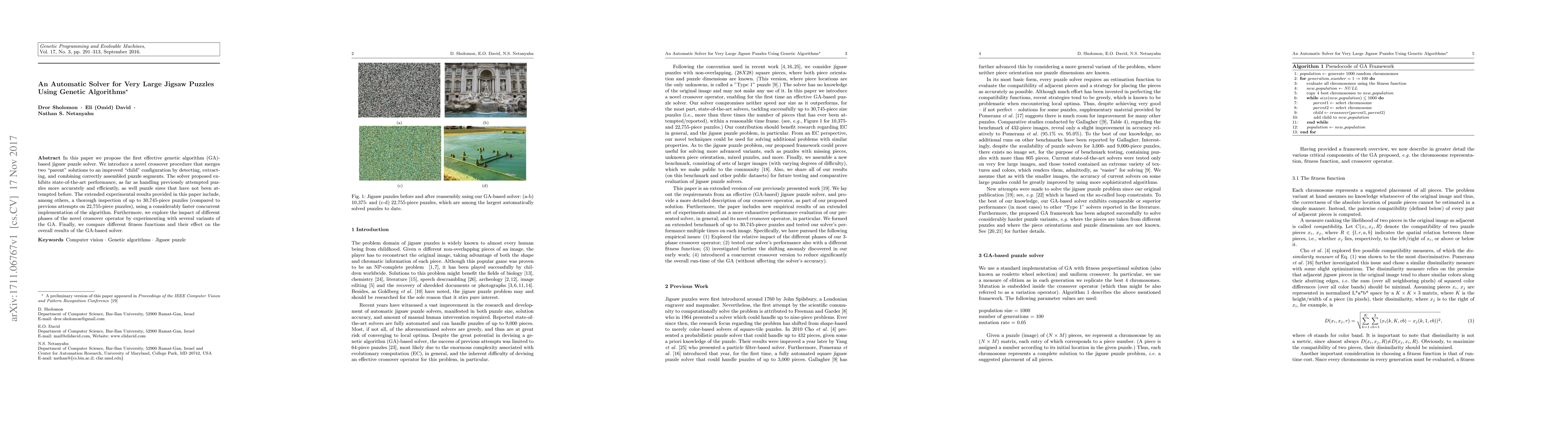 A genetic algorithm-based solver for jigsaw puzzles has been developed, achieving state-of-the-art performance on very large puzzle sizes previously unattempted, using a novel crossover procedure that improves solution accuracy and efficiency.