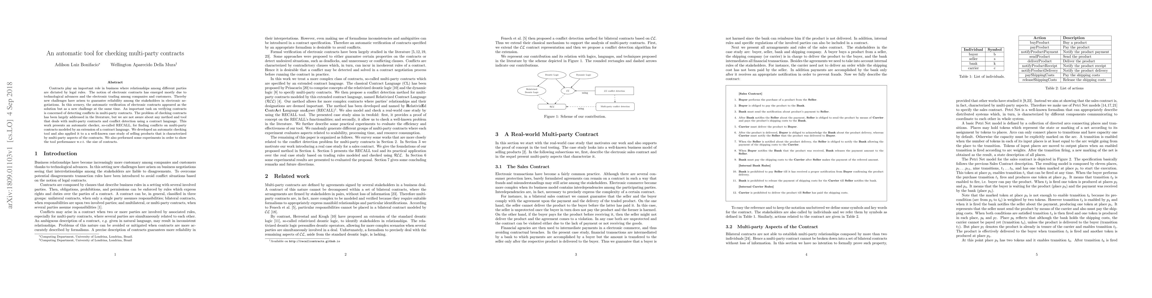 This paper introduces RECALL, an automatic tool for detecting conflicts in multi-party electronic contracts modeled using an extended contract language. The tool was tested on a case study involving product sales, demonstrating its effectiveness in conflict detection.
