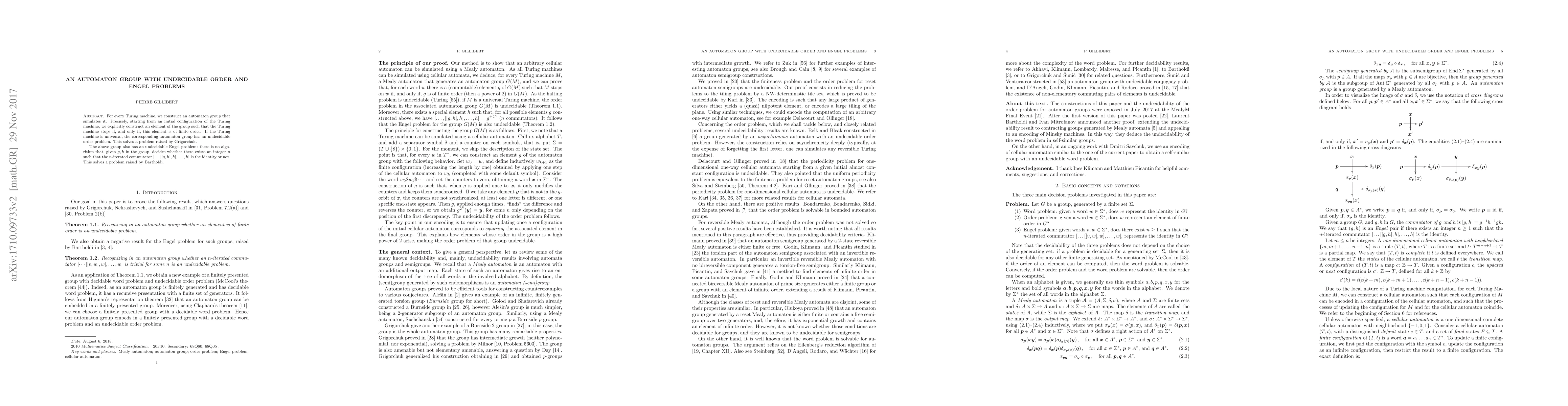 For every Turing machine, we construct an automaton group that simulates it. Precisely, starting from an initial configuration of the Turing machine, we explicitly construct an element of the group such that the Turing machine stops if, and only if, this element is of finite order.If the Turing machine is universal, the corresponding automaton group has an undecidable order problem. This solves a problem raised by Grigorchuk.The above group also has an undecidable Engel problem: there is no algorithm that, given g, h in the group, decides whether there exists an integer n such that the n-iterated commutator [...[[g,h],h],...,h]$ is the identity or not. This solves a problem raised by Bartholdi.