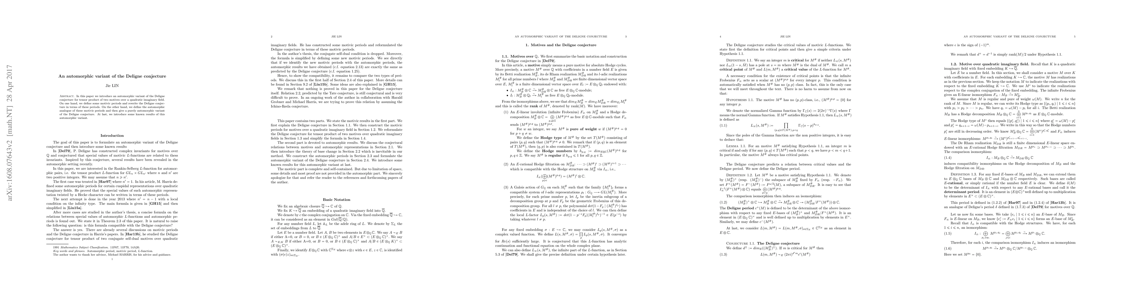 This paper introduces an automorphic variant of the Deligne conjecture for tensor products of motives over quadratic imaginary fields, defining motivic periods and their automorphic analogues to formulate the conjecture in a purely automorphic context, and reviews existing results related to this new formulation.