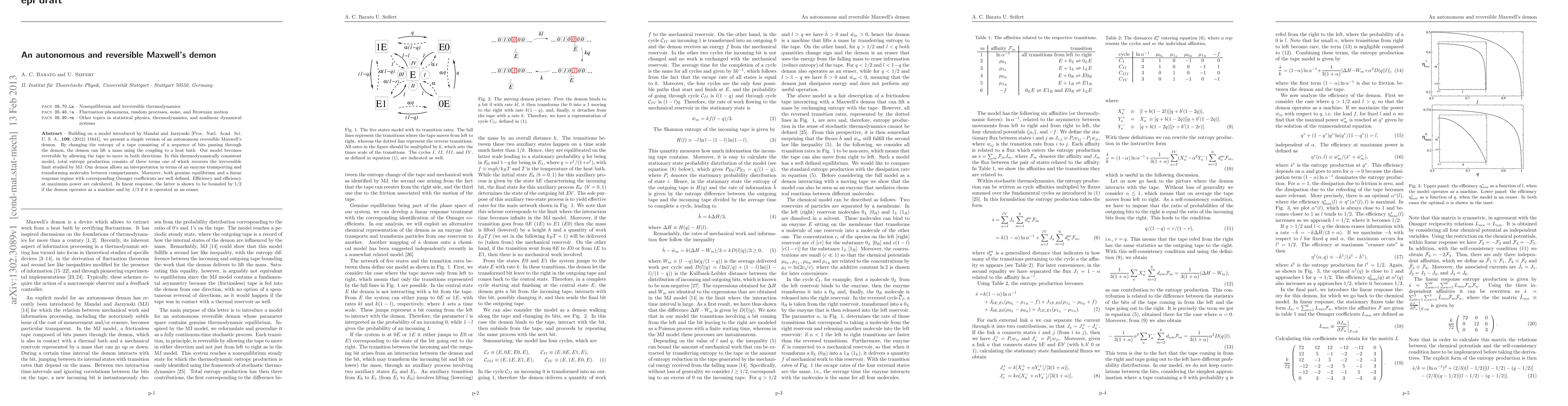 Building on a model introduced by Mandal and Jarzynski [Proc. Natl. Acad. Sci. U. S. A., {\bf 109}, (2012) 11641], we present a simple version of an autonomous reversible Maxwell's demon. By changing the entropy of a tape consisting of a sequence of bits passing through the demon, the demon can lift a mass using the coupling to a heat bath. Our model becomes reversible by allowing the tape to move in both directions. In this thermodynamically consistent model, total entropy production consists of three terms one of which recovers the irreversible limit studied by MJ. Our demon allows an interpretation in terms of an enzyme transporting and transforming molecules between compartments. Moreover, both genuine equilibrium and a linear response regime with corresponding Onsager coefficients are well defined. Efficiency and efficiency at maximum power are calculated. In linear response, the latter is shown to be bounded by 1/2 if the demon operates as a machine and by 1/3 if it is operated as an eraser.