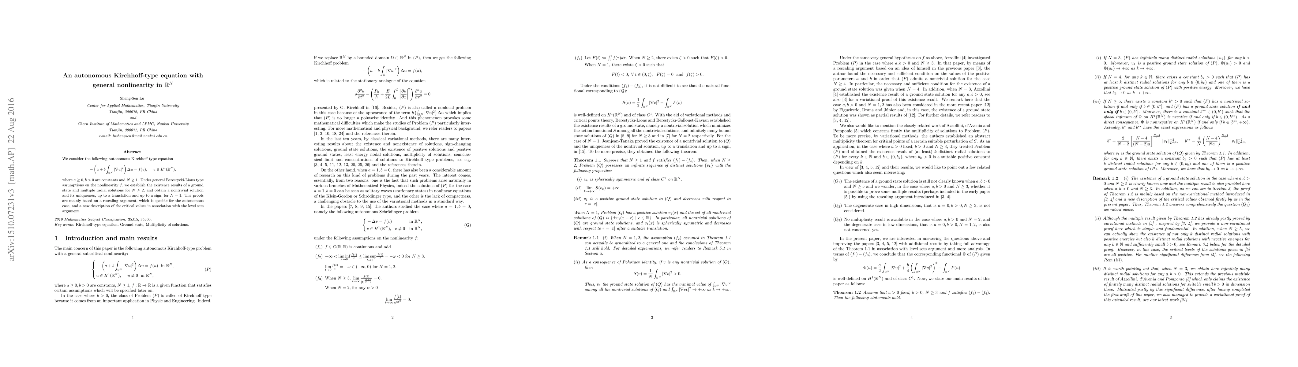 This paper establishes existence results for ground states and multiple radial solutions of an autonomous Kirchhoff-type equation with general nonlinearity in ∞¸N, using a rescaling argument and level sets argument.