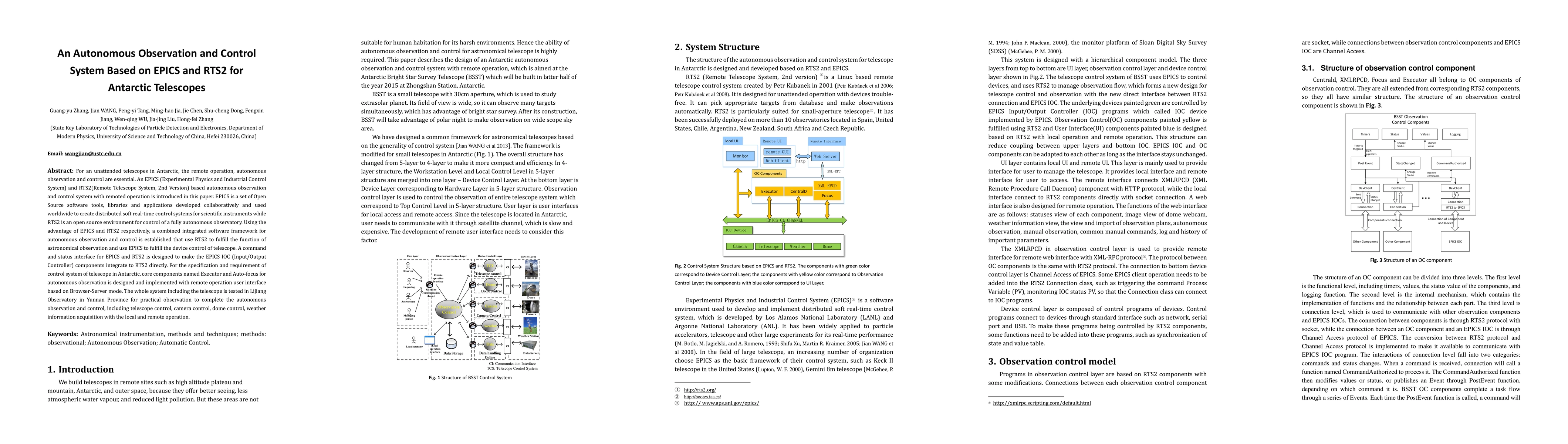 This paper introduces an integrated autonomous observation and control system for Antarctic telescopes using EPICS and RTS2, enabling remote operation and fully autonomous functions. The system combines RTS2 for astronomical observation and EPICS for device control, with a command interface for integration, and includes core components for autonomous observation and remote operation.