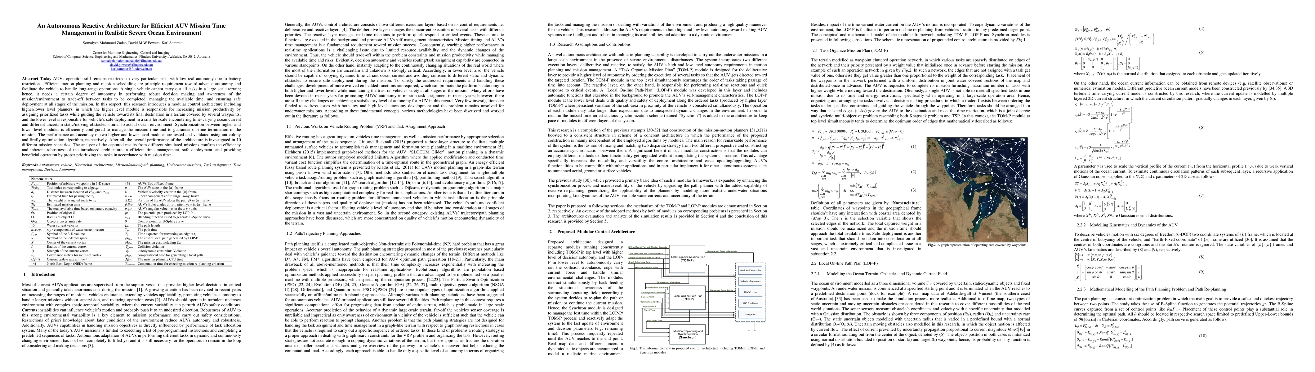 Today AUVs operation still remains restricted to very particular tasks with low real autonomy due to battery restrictions. Efficient motion planning and mission scheduling are principle requirement toward advance autonomy and facilitate the vehicle to handle long-range operations. A single vehicle cannot carry out all tasks in a large scale terrain; hence, it needs a certain degree of autonomy in performing robust decision making and awareness of the mission/environment to trade-off between tasks to be completed, managing the available time, and ensuring safe deployment at all stages of the mission. In this respect, this research introduces a modular control architecture including higher/lower level planners, in which the higher level module is responsible for increasing mission productivity by assigning prioritized tasks while guiding the vehicle toward its final destination in a terrain covered by several waypoints; and the lower level is responsible for vehicle's safe deployment in a smaller scale encountering time-varying ocean current and different uncertain static/moving obstacles similar to actual ocean environment. Synchronization between higher and lower level modules is efficiently configured to manage the mission time and to guarantee on-time termination of the mission. The performance and accuracy of two higher and lower level modules are tested and validated using ant colony and firefly optimization algorithm, respectively. After all, the overall performance of the architecture is investigated in 10 different mission scenarios. The analyze of the captured results from different simulated missions confirm the efficiency and inherent robustness of the introduced architecture in efficient time management, safe deployment, and providing beneficial operation by proper prioritizing the tasks in accordance with mission time.