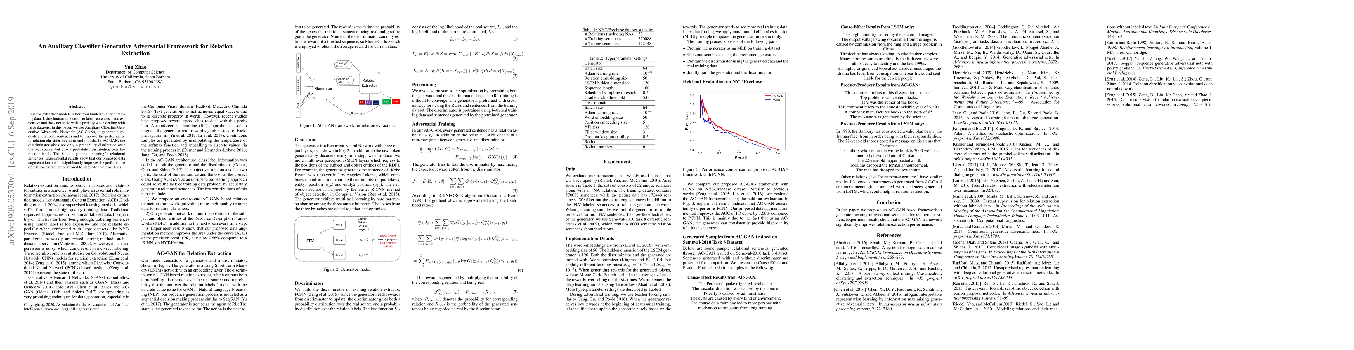 Relation extraction models suffer from limited qualified training data. Using human annotators to label sentences is too expensive and does not scale well especially when dealing with large datasets. In this paper, we use Auxiliary Classifier Generative Adversarial Networks (AC-GANs) to generate high-quality relational sentences and to improve the performance of relation classifier in end-to-end models. In AC-GAN, the discriminator gives not only a probability distribution over the real source, but also a probability distribution over the relation labels. This helps to generate meaningful relational sentences. Experimental results show that our proposed data augmentation method significantly improves the performance of relation extraction compared to state-of-the-art methods
