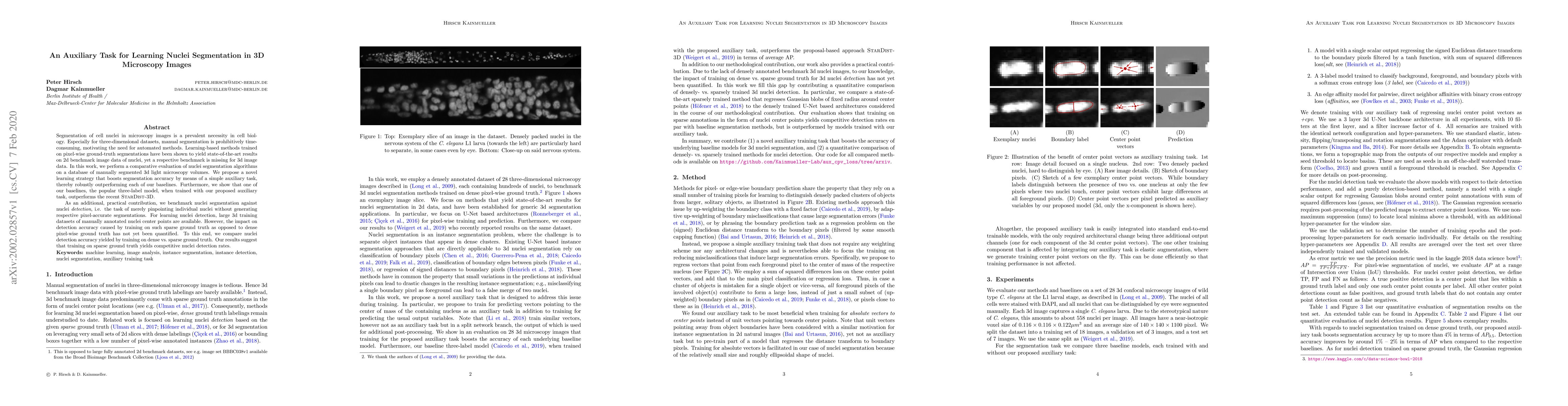 This paper proposes a novel learning strategy to enhance 3D nuclei segmentation in microscopy images using an auxiliary task, achieving better results than existing baselines. It also compares the effectiveness of dense vs. sparse ground truth for nuclei detection, finding that sparse data can yield competitive detection rates.