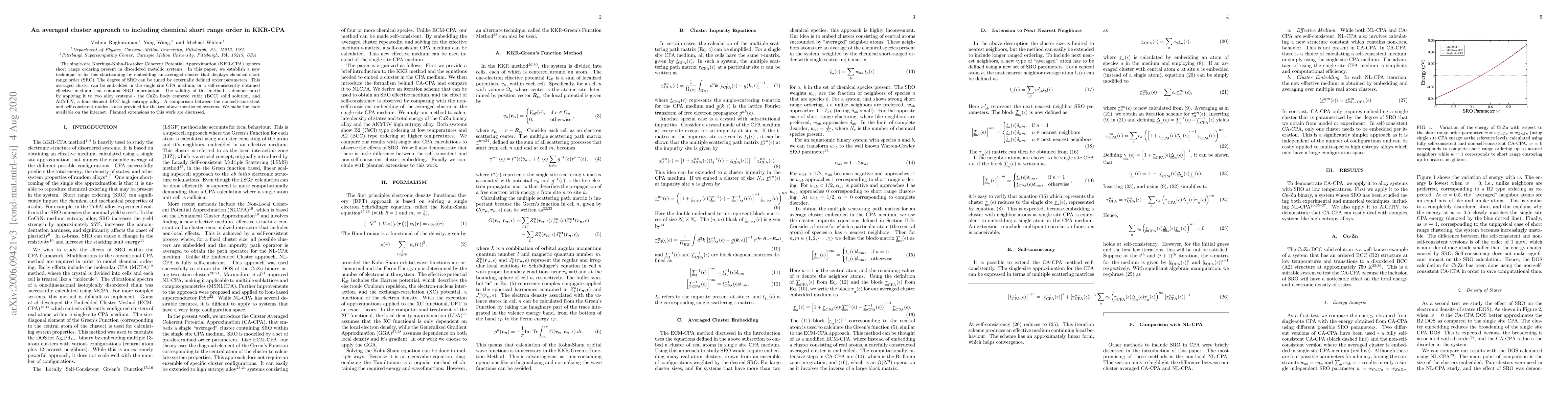 This paper introduces a new method to incorporate chemical short range order into KKR-CPA by embedding an averaged cluster, which can be adjusted using defined order parameters. The technique is validated on CuZn and AlCrTiV alloy systems, demonstrating its effectiveness in both non-self-consistent and self-consistent modes.