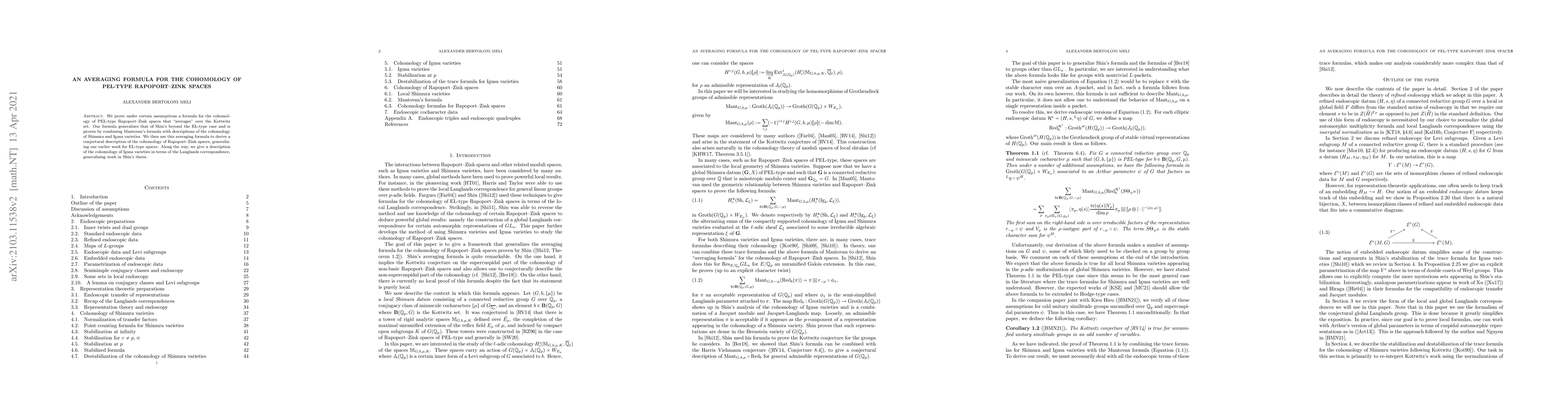 The paper proves a formula for the cohomology of PEL-type Rapoport-Zink spaces that averages over the Kottwitz set, generalizing Shin's work. It combines Mantovan's formula with descriptions of the cohomology of Shimura and Igusa varieties to derive a conjectural description of the cohomology for these spaces.