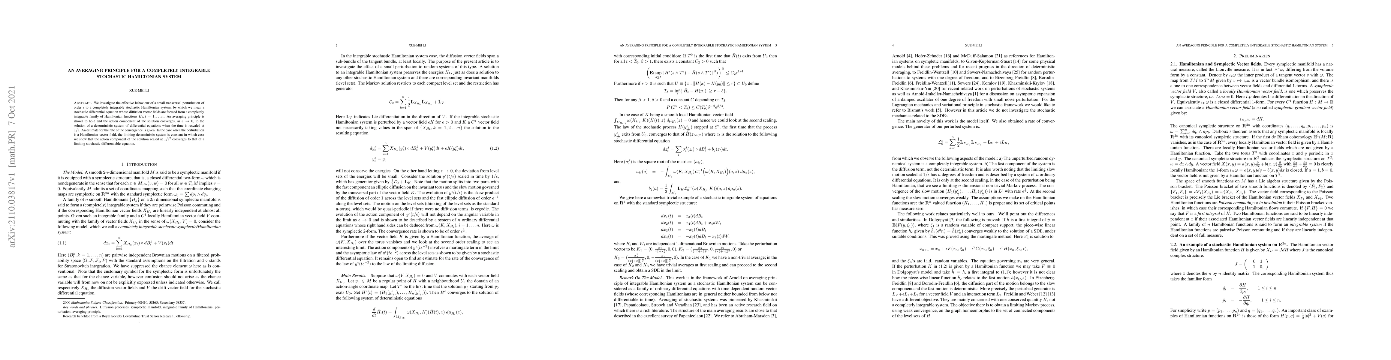 This paper explores the behavior of a small perturbation in a completely integrable stochastic Hamiltonian system, demonstrating an averaging principle that leads to convergence of the action component to a deterministic system as the perturbation size approaches zero. The rate of convergence is estimated, and special cases involving Hamiltonian vector fields are analyzed.