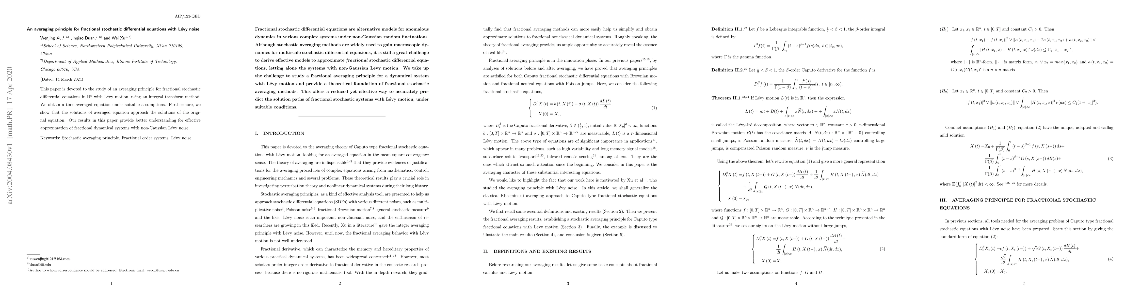 This paper is devoted to the study of an averaging principle for fractional stochastic differential equations in Rnwith L\'evy motion, using an integral transform method. We obtain a time-averaged equation under suitable assumptions. Furthermore, we show that the solutions of averaged equation approach the solutions of the original equation. Our results in this paper provide better understanding for effective approximation of fractional dynamical systems with non-Gaussian L\'evy noise.