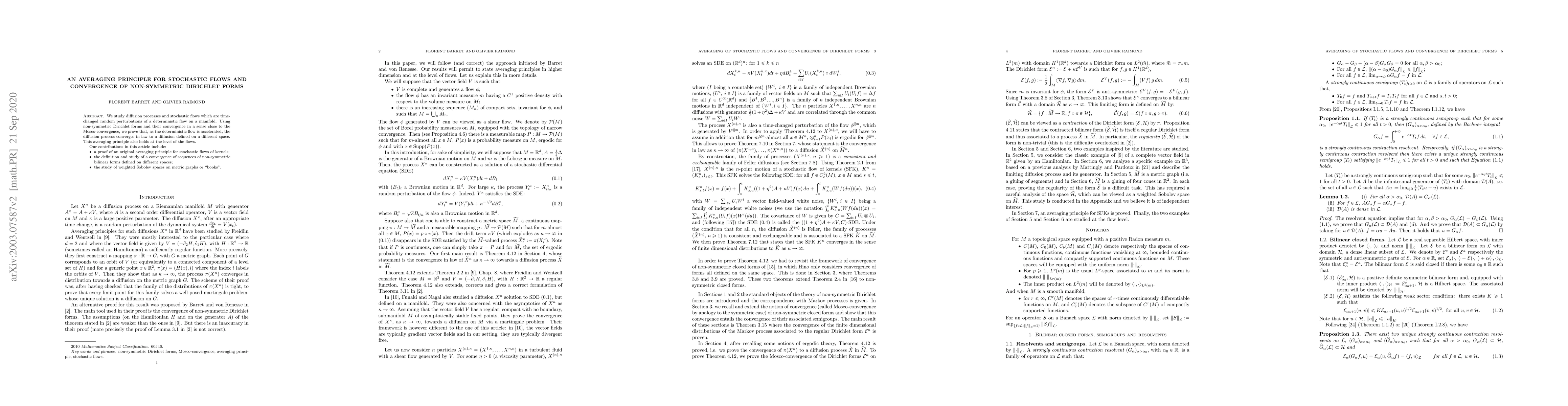 We study diffusion processes and stochastic flows which are time-changed random perturbations of a deterministic flow on a manifold. Using non-symmetric Dirichlet forms and their convergence in a sense close to the Mosco-convergence, we prove that, as the deterministic flow is accelerated, the diffusion process converges in law to a diffusion defined on a different space. This averaging principle also holds at the level of the flows. Our contributions in this article include: a proof of an original averaging principle for stochastic flows of kernels; the definition and study of a convergence of sequences of non-symmetric bilinear forms defined on different spaces; the study of weighted Sobolev spaces on metric graphs or "books".