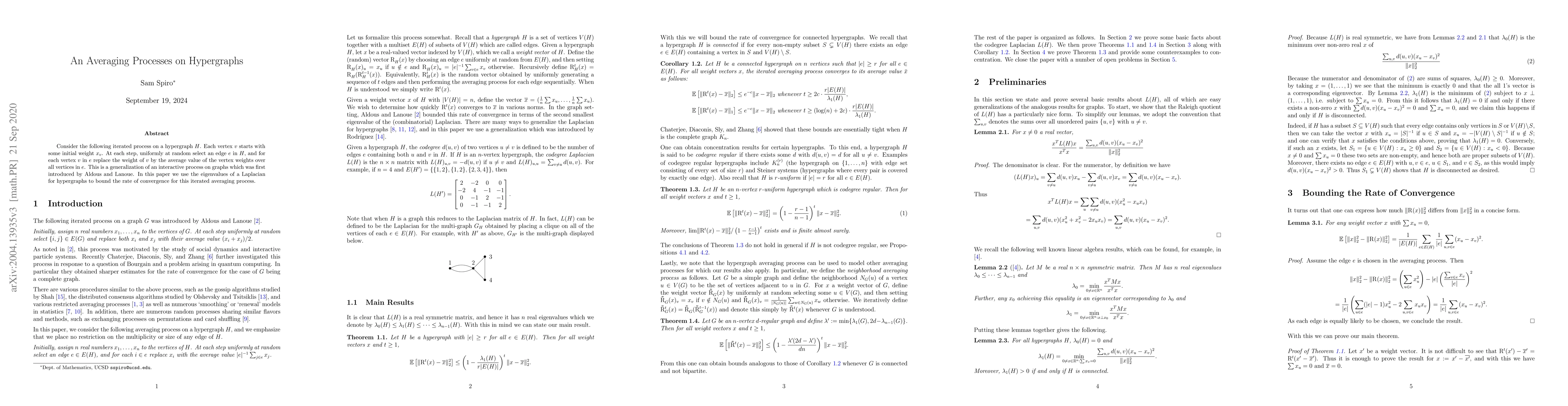 This research paper introduces an averaging process on hypergraphs, where vertex weights are updated based on the average of neighboring vertices, and bounds the rate of convergence using Laplacian eigenvalues.