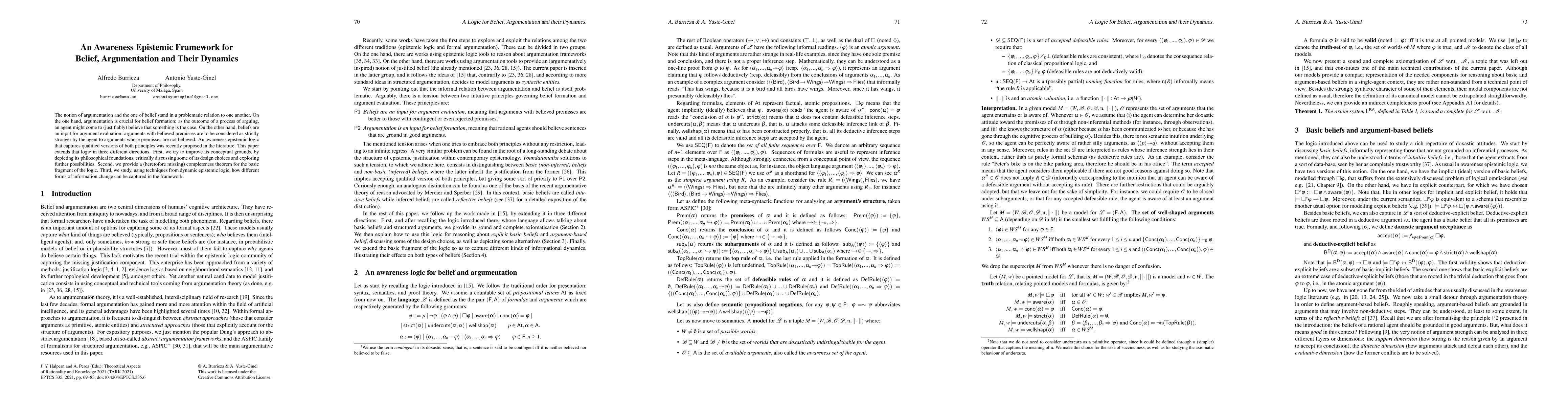 The notion of argumentation and the one of belief stand in a problematic relation to one another. On the one hand, argumentation is crucial for belief formation: as the outcome of a process of arguing, an agent might come to (justifiably) believe that something is the case. On the other hand, beliefs are an input for argument evaluation: arguments with believed premisses are to be considered as strictly stronger by the agent to arguments whose premisses are not believed. An awareness epistemic logic that captures qualified versions of both principles was recently proposed in the literature. This paper extends that logic in three different directions. First, we try to improve its conceptual grounds, by depicting its philosophical foundations, critically discussing some of its design choices and exploring further possibilities. Second, we provide a (heretofore missing) completeness theorem for the basic fragment of the logic. Third, we study, using techniques from dynamic epistemic logic, how different forms of information change can be captured in the framework.