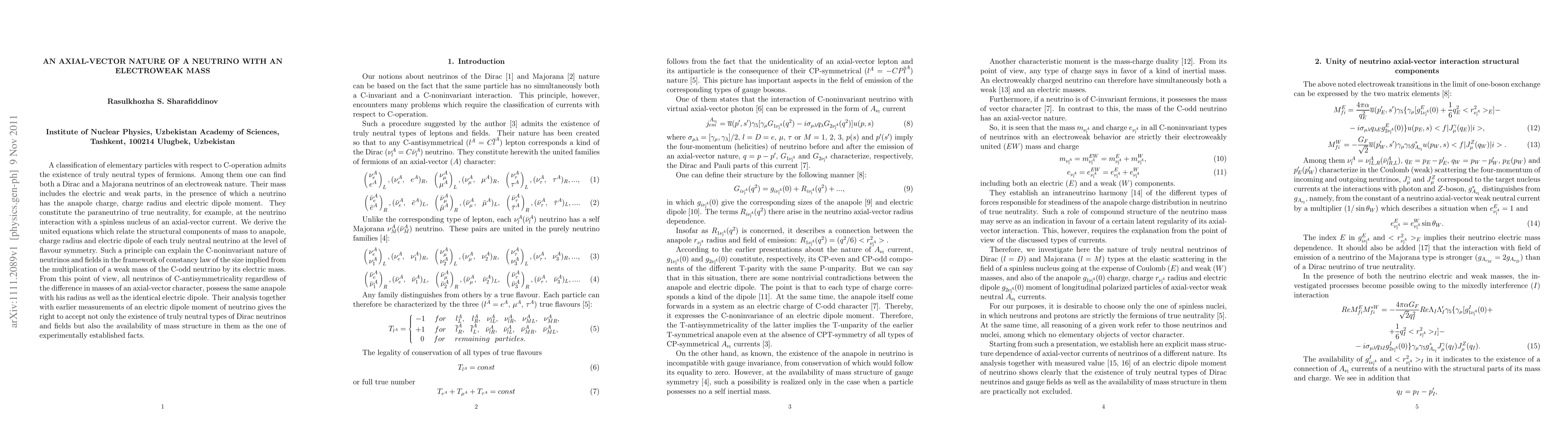 A classification of elementary particles with respect to C-operation admits the existence of truly neutral types of fermions. Among them one can find both a Dirac and a Majorana neutrinos of an electroweak nature. Their mass includes the electric and weak parts, in the presence of which a neutrino has the anapole charge, charge radius and electric dipole moment. They constitute the paraneutrino of true neutrality, for example, at the neutrino interaction with a spinless nucleus of an axial-vector current. We derive the united equations which relate the structural components of mass to anapole, charge radius and electric dipole of each truly neutral neutrino at the level of flavour symmetry. Such a principle can explain the C-noninvariant nature of neutrinos and fields in the framework of constancy law of the size implied from the multiplication of a weak mass of the C-odd neutrino by its electric mass. From this point of view, all neutrinos of C-antisymmetricality regardless of the difference in masses of an axial-vector character, possess the same anapole with his radius as well as the identical electric dipole. Their analysis together with earlier measurements of an electric dipole moment of neutrino gives the right to accept not only the existence of truly neutral types of Dirac neutrinos and fields but also the availability of mass structure in them as the one of experimentally established facts.