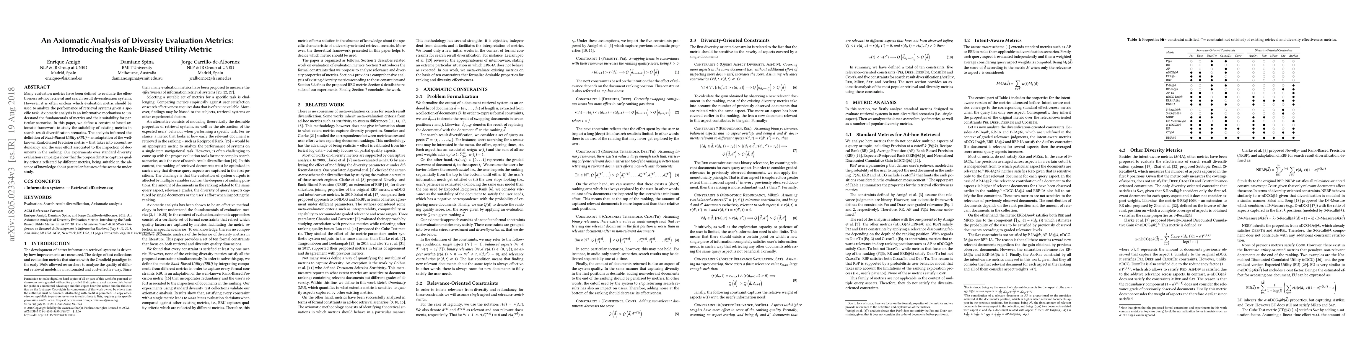Many evaluation metrics have been defined to evaluate the effectiveness ad-hoc retrieval and search result diversification systems. However, it is often unclear which evaluation metric should be used to analyze the performance of retrieval systems given a specific task. Axiomatic analysis is an informative mechanism to understand the fundamentals of metrics and their suitability for particular scenarios. In this paper, we define a constraint-based axiomatic framework to study the suitability of existing metrics in search result diversification scenarios. The analysis informed the definition of Rank-Biased Utility (RBU) -- an adaptation of the well-known Rank-Biased Precision metric -- that takes into account redundancy and the user effort associated to the inspection of documents in the ranking. Our experiments over standard diversity evaluation campaigns show that the proposed metric captures quality criteria reflected by different metrics, being suitable in the absence of knowledge about particular features of the scenario under study.