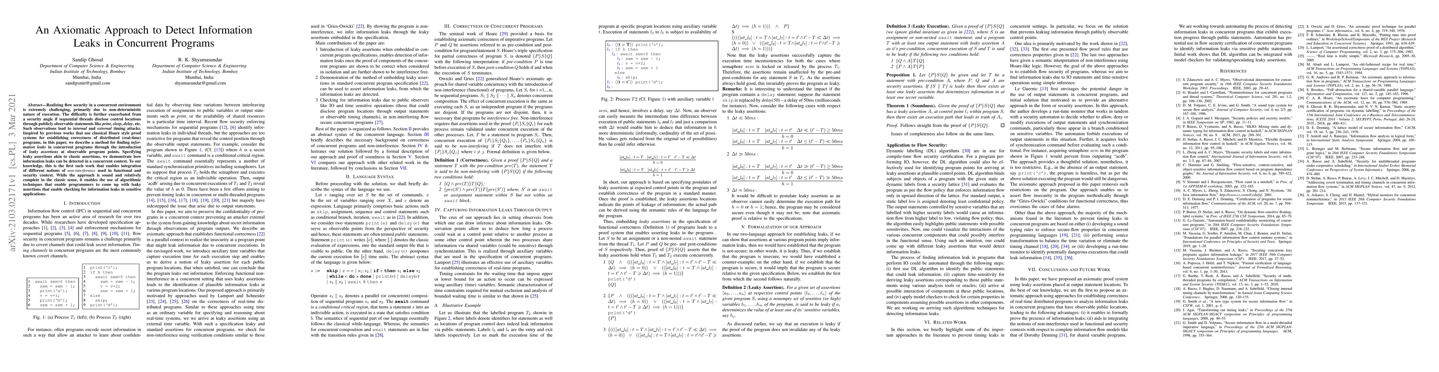This paper proposes an axiomatic method for detecting information leaks in concurrent programs by introducing leaky assertions at observable points, enabling detection of internal and external timing attacks. It integrates different notions of non-interference and uses algorithmic techniques to help programmers identify and mitigate such leaks.
