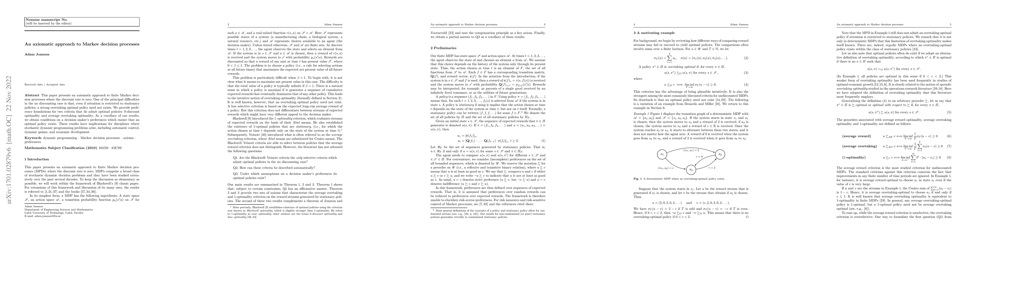 This paper proposes an axiomatic framework for finite Markov decision processes with zero discount rate, establishing preference foundations for $0$-discount optimality and average overtaking optimality to ensure the existence of optimal policies. The findings have relevance for automatic control, dynamic games, and economic development.