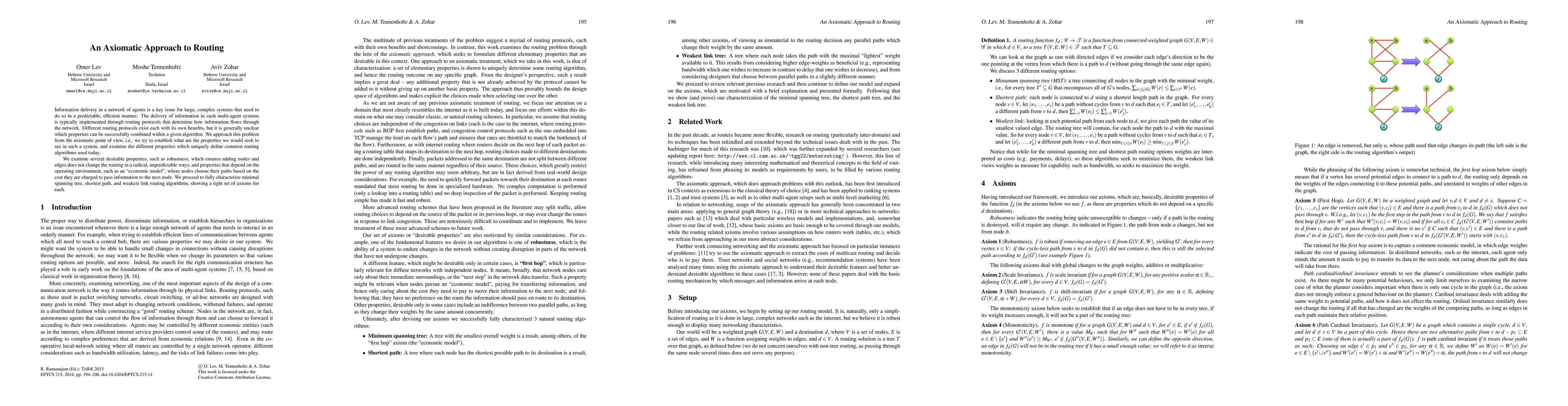 Information delivery in a network of agents is a key issue for large, complex systems that need to do so in a predictable, efficient manner. The delivery of information in such multi-agent systems is typically implemented through routing protocols that determine how information flows through the network. Different routing protocols exist each with its own benefits, but it is generally unclear which properties can be successfully combined within a given algorithm. We approach this problem from the axiomatic point of view, i.e., we try to establish what are the properties we would seek to see in such a system, and examine the different properties which uniquely define common routing algorithms used today. We examine several desirable properties, such as robustness, which ensures adding nodes and edges does not change the routing in a radical, unpredictable ways; and properties that depend on the operating environment, such as an "economic model", where nodes choose their paths based on the cost they are charged to pass information to the next node. We proceed to fully characterize minimal spanning tree, shortest path, and weakest link routing algorithms, showing a tight set of axioms for each.