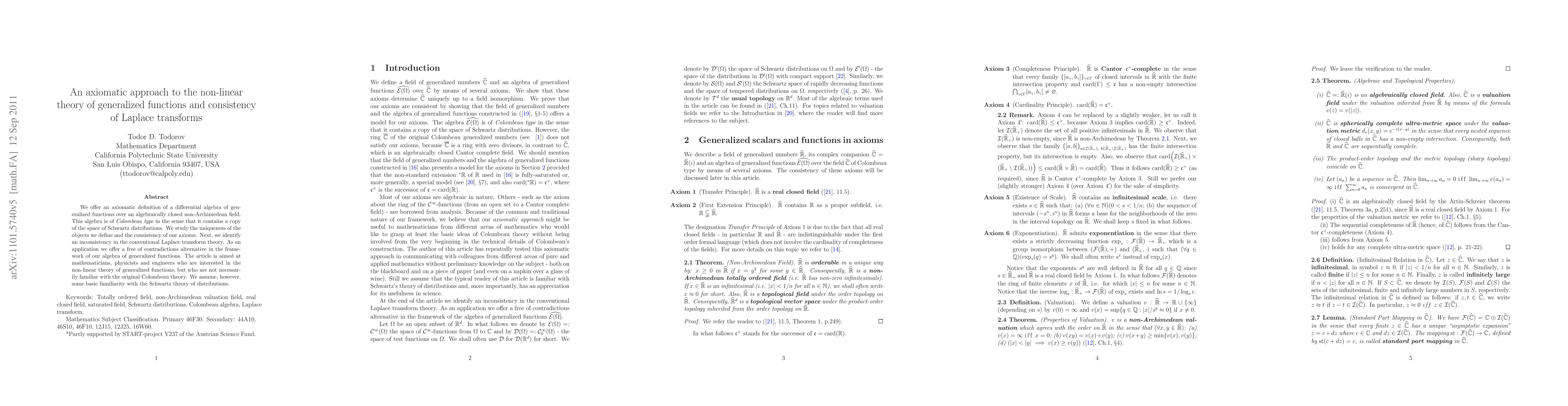 Researchers provide an axiomatic definition of a differential algebra for generalized functions, offering a new alternative to conventional Laplace transform theory without inconsistencies, aiming at non-linear theory enthusiasts in mathematics, physics, and engineering.