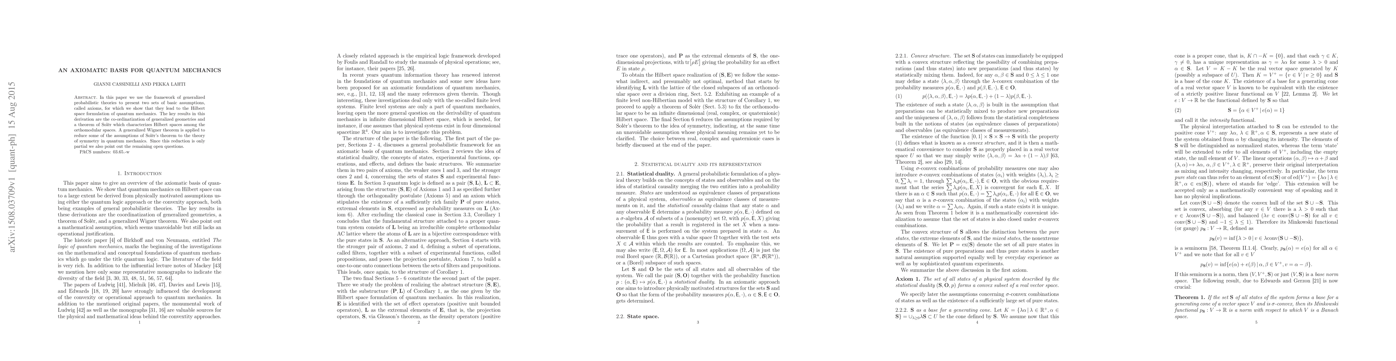 In this paper we use the framework of generalized probabilistic theories to present two sets of basic assumptions, called axioms, for which we show that they lead to the Hilbert space formulation of quantum mechanics. The key results in this derivation are the co-ordinatization of generalized geometries and a theorem of Sol\'er which characterizes Hilbert spaces among the orthomodular spaces. A generalized Wigner theorem is applied to reduce some of the assumptions of the theorem of Sol\'er to the theory of symmetry in quantum mechanics. Since this reduction is only partial we also point out the remaining open questions.