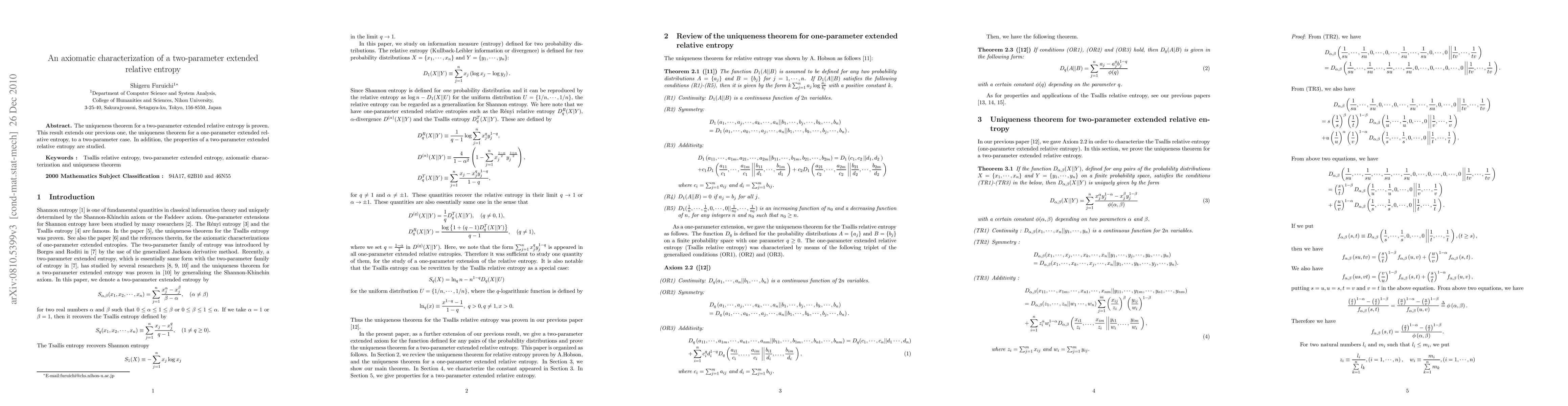 This paper proves the uniqueness theorem for a two-parameter extended relative entropy, extending previous results for the one-parameter case. It also explores the properties of this two-parameter extended relative entropy.