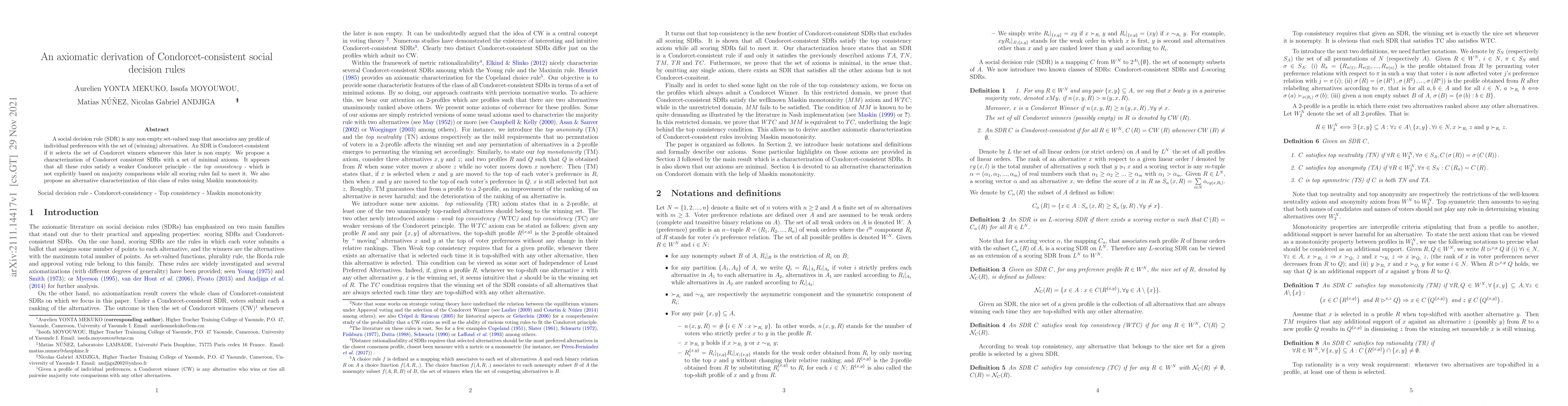 This paper characterizes Condorcet-consistent social decision rules through a minimal set of axioms, showing that these rules satisfy the top consistency principle rather than relying on majority comparisons. An alternative characterization is also provided using Maskin monotonicity.