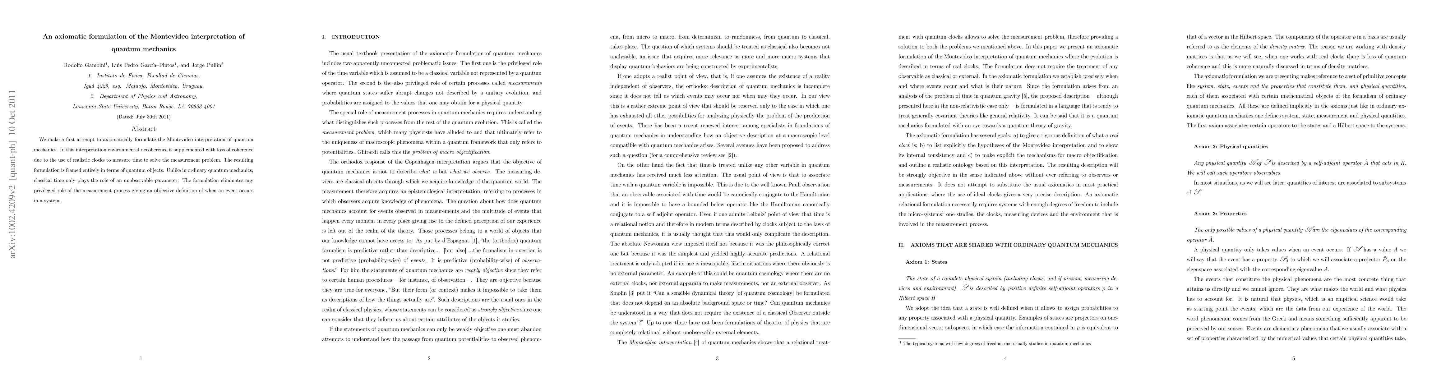 This paper proposes an axiomatic framework for the Montevideo interpretation of quantum mechanics, which resolves the measurement problem by incorporating both environmental decoherence and the loss of coherence from using realistic clocks, all framed within quantum objects without classical reference to time. This approach eliminates the privileged role of measurement and provides an objective definition of event occurrence.