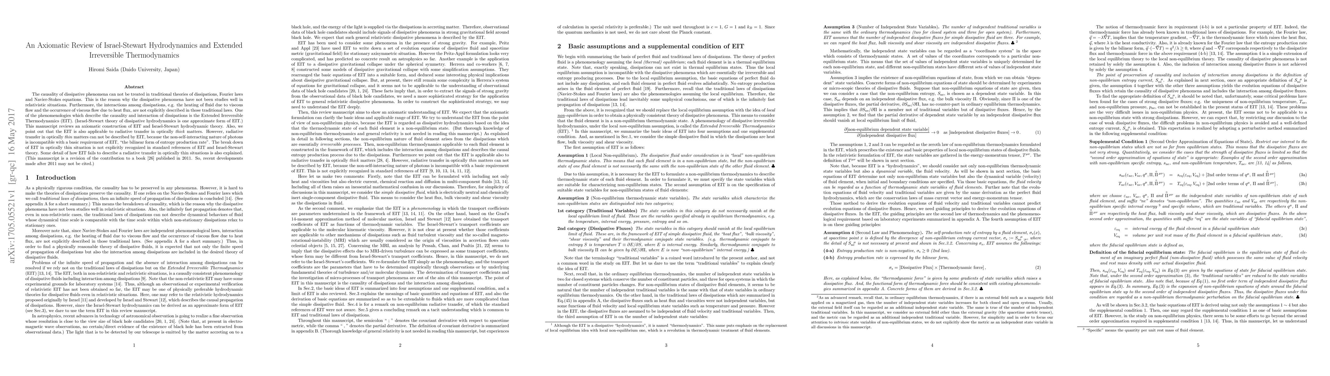 The causality of dissipative phenomena can not be treated in traditional theories of dissipations, Fourier laws and Navier-Stokes equations. This is the reason why the dissipative phenomena have not been studies well in relativistic situations. Furthermore, the interactions among dissipations, e.g. the heating of fluid due to viscous flow and the occurrence of viscous flow due to heat flux, are not explicitly described in those traditional laws. One of the phenomenologies which describe the causality and interaction of dissipations is the Extended Irreversible Thermodynamics (EIT). (Israel-Stewart theory of dissipative hydrodynamics is one approximate form of EIT.) This manuscript reviews an axiomatic construction of EIT and Israel-Stewart hydrodynamic theory. Also, we point out that the EIT is also applicable to radiative transfer in optically \emph{thick} matters. However, radiative transfer in optically \emph{thin} matters can not be described by EIT, because the non-self-interacting nature of photons is incompatible with a basic requirement of EIT, "the bilinear form of entropy production rate". The break down of EIT in optically thin situation is not explicitly recognized in standard references of EIT and Israel-Stewart theory. Some detail of how EIT fails to describe a radiative transfer in optically thin situations is also explained. (This manuscript is a revision of the contribution to a book Ref.[26] published in 2011. So, recent developments made after 2011 may not be cited.)