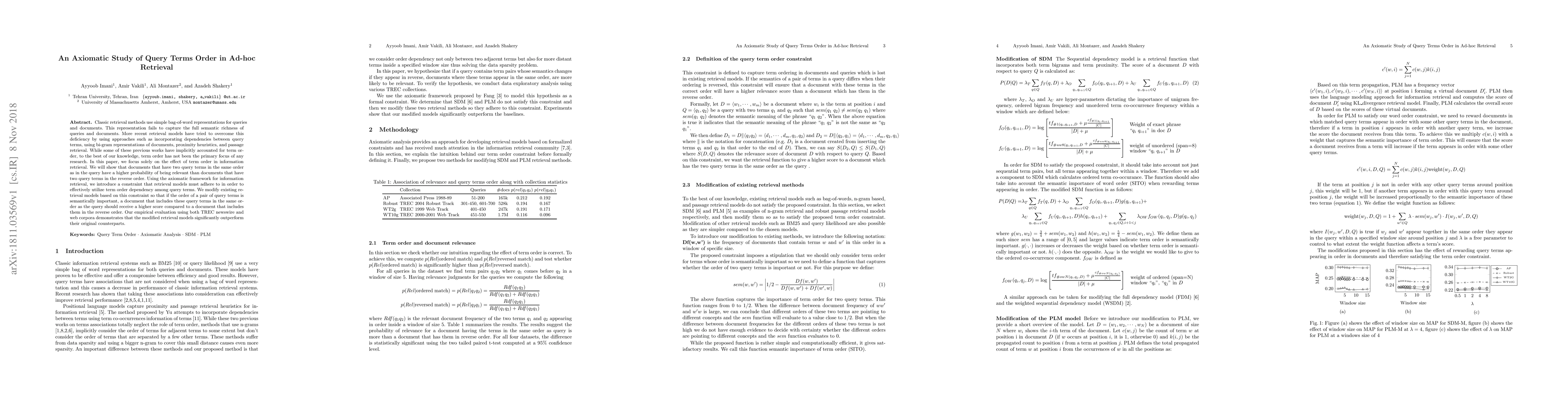 This paper investigates the impact of query term order on ad-hoc retrieval, proposing an axiomatic framework to incorporate term order dependencies. Empirical results show that modified retrieval models, which prioritize term order, outperform traditional models on TREC datasets.
