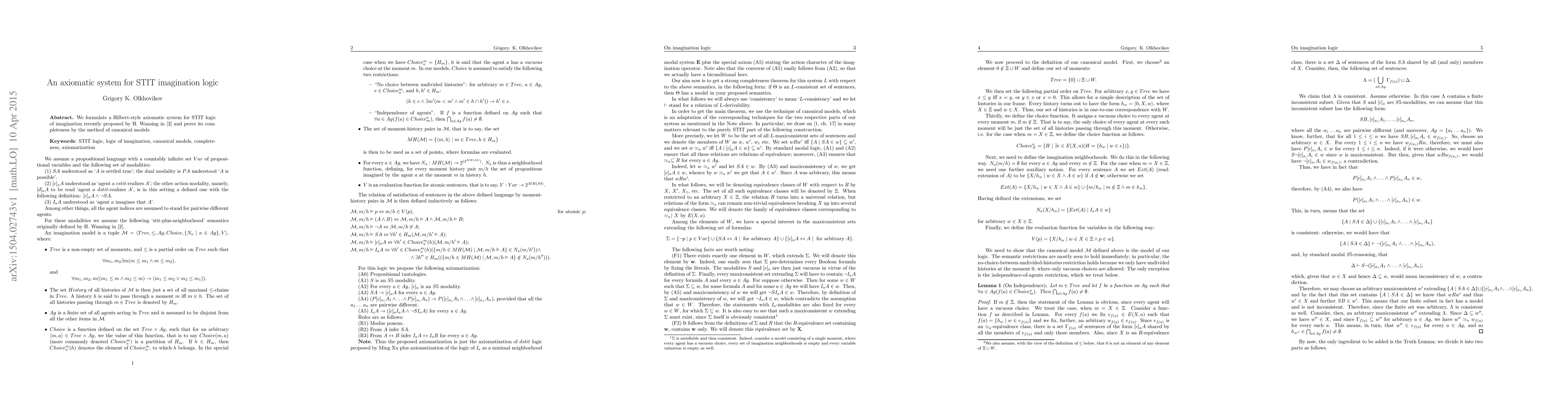 This paper proposes a new axiomatic system for STIT imagination logic, a type of logic used to reason about possibility and impossibility in imaginative scenarios. It proves the completeness of this system using canonical models.