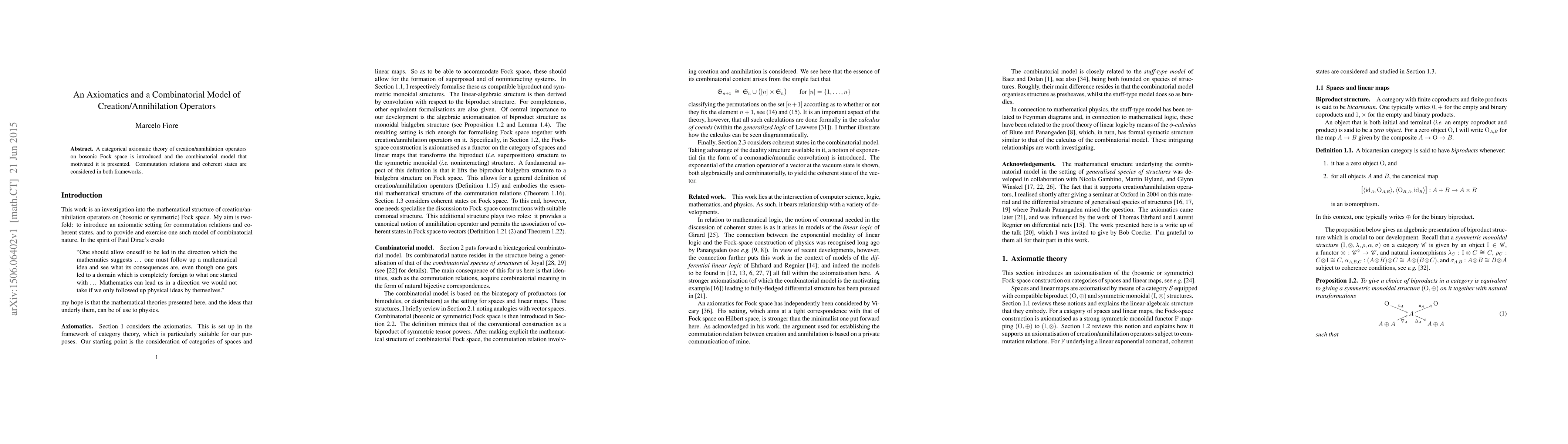 A categorical axiomatic theory of creation/annihilation operators on bosonic Fock space is introduced and the combinatorial model that motivated it is presented. Commutation relations and coherent states are considered in both frameworks.