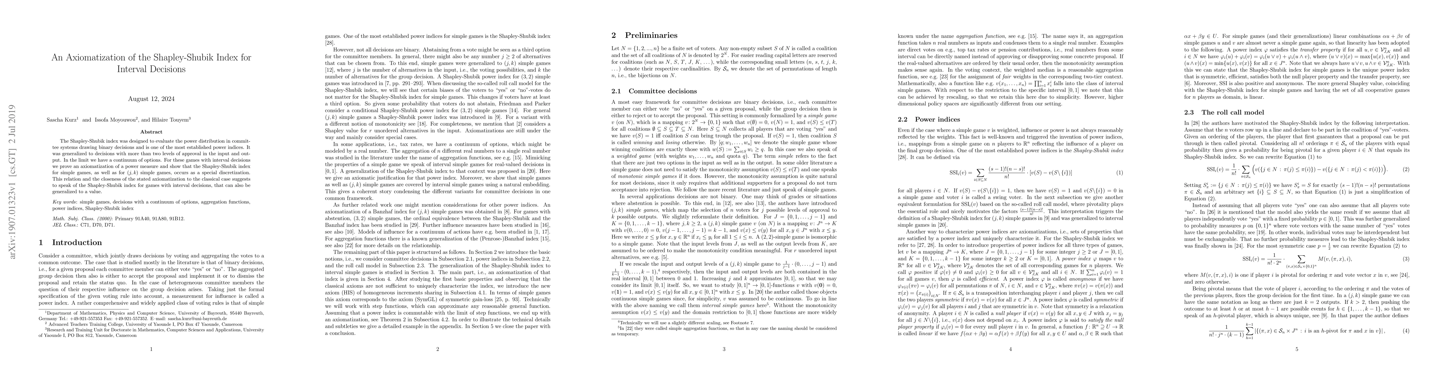 This paper axiomatizes the Shapley-Shubik index for games with interval decisions, showing its special discretization from the classical case and extending its applicability to a continuum of options. The authors demonstrate that the index remains a relevant measure of power distribution even in more complex decision-making scenarios.