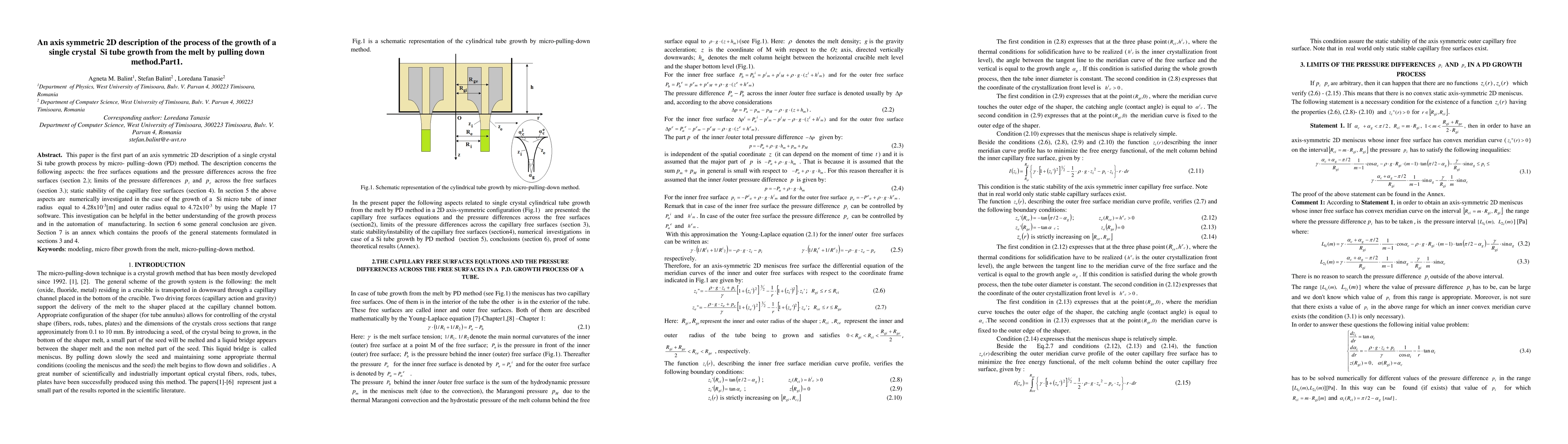 This paper is the first part of an axis symmetric description of a single crystal tube growth process by micro-pulling-down method.the description concerns the following aspects:the free surfaces equations and the pressure difference across the free surfaces (section 2) , limits of the pressure differences across the free surfaces (section 3) ;static stability of the capillary free surfaces (section 4). In section 5 the above aspects are numerically investigated in case of a silicon tube growth.This investigation can be helpful in the better understanding the growth process and in the automation of manufacturing.In section 6 some general conclusion are given.Section 7 is an annex which contains the proof of the general statements formulated in sections 3 and 4.