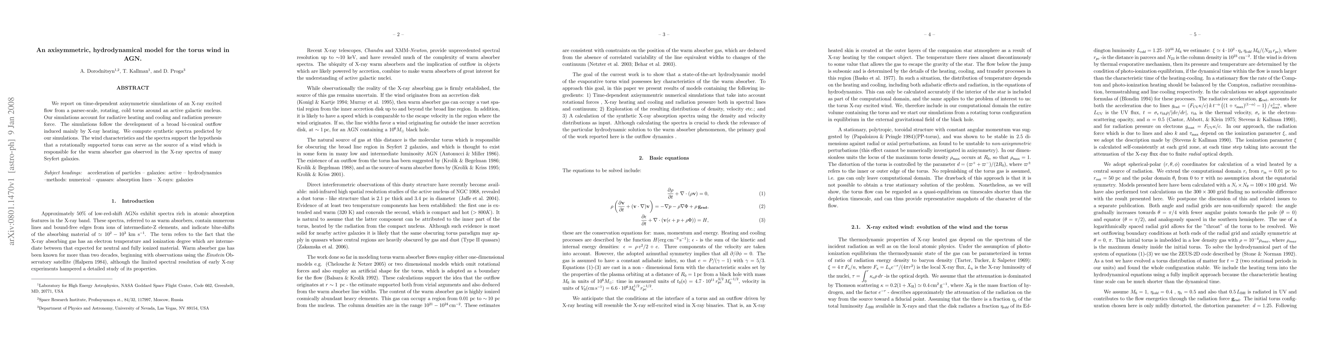 We report on time-dependent axisymmetric simulations of an X-ray excited flow from a parsec-scale, rotating, cold torus around an active galactic nucleus. Our simulations account for radiative heating and cooling and radiation pressure force. The simulations follow the development of a broad bi-conical outflow induced mainly by X-ray heating. We compute synthetic spectra predicted by our simulations. The wind characteristics and the spectra support the hypothesis that a rotationally supported torus can serve as the source of a wind which is responsible for the warm absorber gas observed in the X-ray spectra of many Seyfert galaxies.