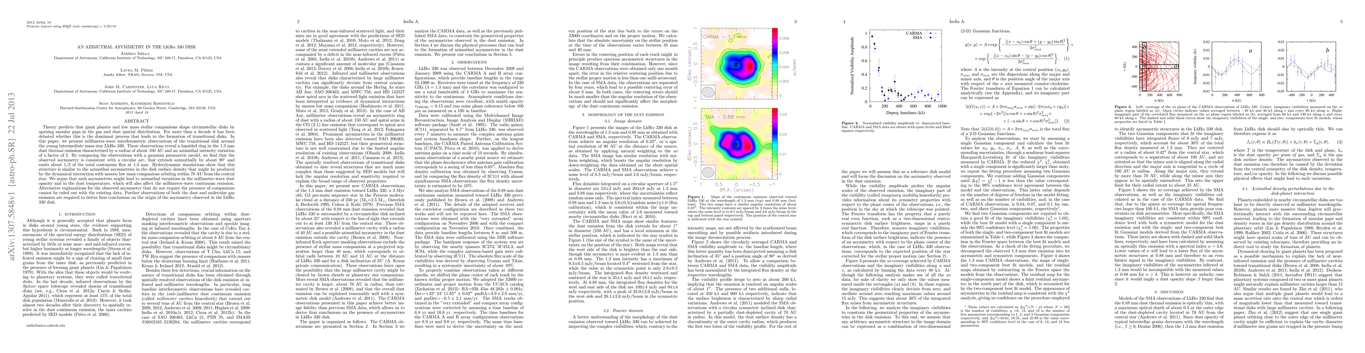 Theory predicts that giant planets and low mass stellar companions shape circumstellar disks by opening annular gaps in the gas and dust spatial distribution. For more than a decade it has been debated whether this is the dominant process that leads to the formation of transitional disks. In this paper, we present millimeter-wave interferometric observations of the transitional disk around the young intermediate mass star LkHa330. These observations reveal a lopsided ring in the 1.3 mm dust thermal emission characterized by a radius of about 100 AU and an azimuthal intensity variation of a factor of 2. By comparing the observations with a Gaussian parametric model, we find that the observed asymmetry is consistent with a circular arc, that extends azimuthally by about 90 deg and emits about 1/3 of the total continuum flux at 1.3 mm. Hydrodynamic simulations show that this structure is similar to the azimuthal asymmetries in the disk surface density that might be produced by the dynamical interaction with unseen low mass companions orbiting within 70 AU from the central star. We argue that such asymmetries might lead to azimuthal variations in the millimeter-wave dust opacity and in the dust temperature, which will also affect the millimeter-wave continuum emission. Alternative explanations for the observed asymmetry that do not require the presence of companions cannot be ruled out with the existing data. Further observations of both the dust and molecular gas emission are required to derive firm conclusions on the origin of the asymmetry observed in the LkHa330 disk.