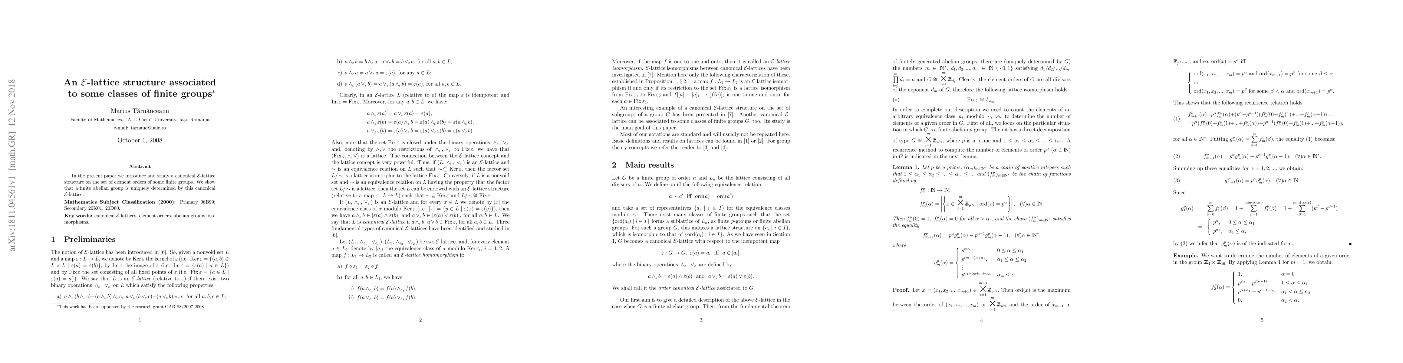 In the present paper we introduce and study a canonical ${\cal E}$-lattice structure on the set of element orders of some finite groups. We show that a finite abelian group is uniquely determined by this canonical ${\cal E}$-lattice.