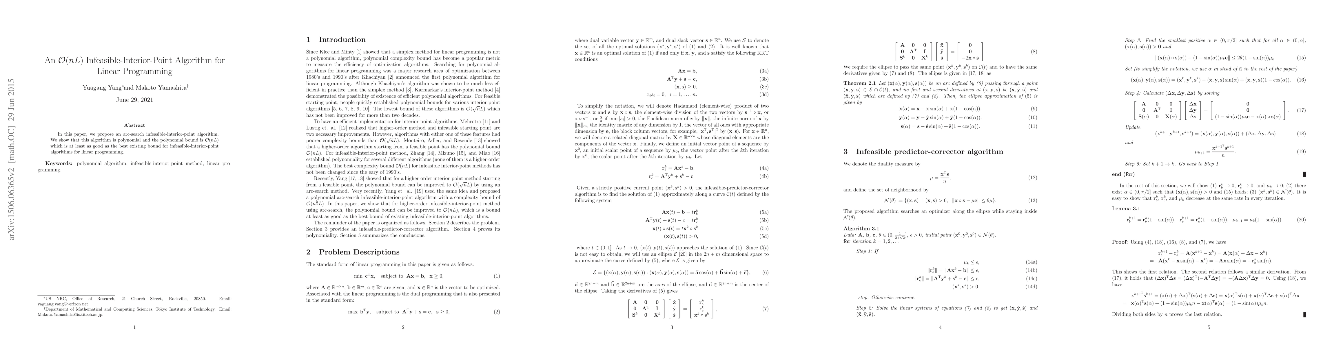 This paper introduces an ${\cal O}(nL)$ infeasible-interior-point algorithm for linear programming, demonstrating its polynomial complexity and achieving at least the best existing bound for such algorithms.