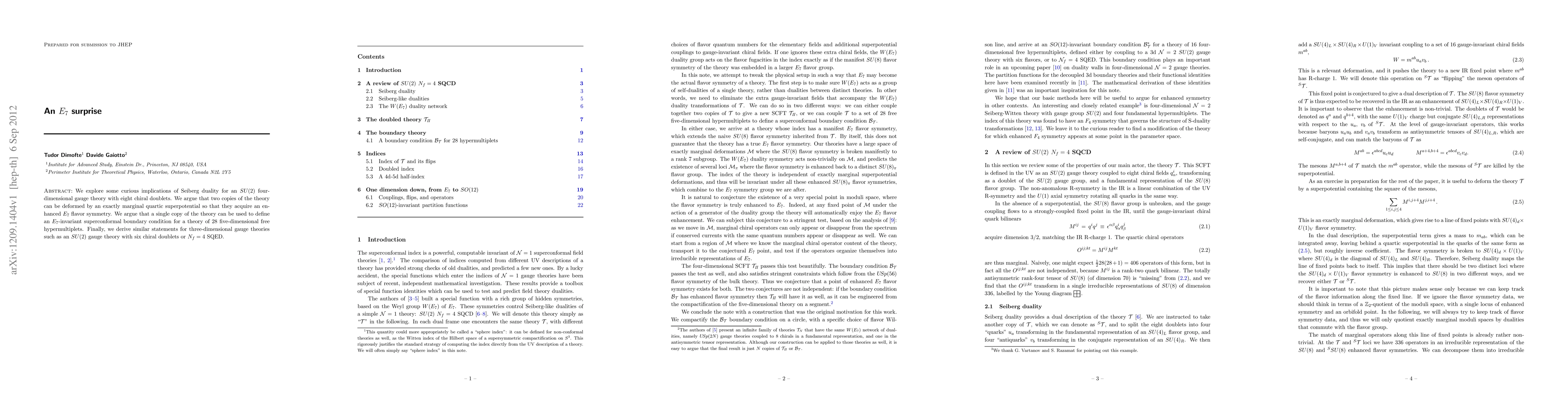 We explore some curious implications of Seiberg duality for an SU(2) four-dimensional gauge theory with eight chiral doublets. We argue that two copies of the theory can be deformed by an exactly marginal quartic superpotential so that they acquire an enhanced E7 flavor symmetry. We argue that a single copy of the theory can be used to define an E7-invariant superconformal boundary condition for a theory of 28 five-dimensional free hypermultiplets. Finally, we derive similar statements for three-dimensional gauge theories such as an SU(2) gauge theory with six chiral doublets or Nf=4 SQED.