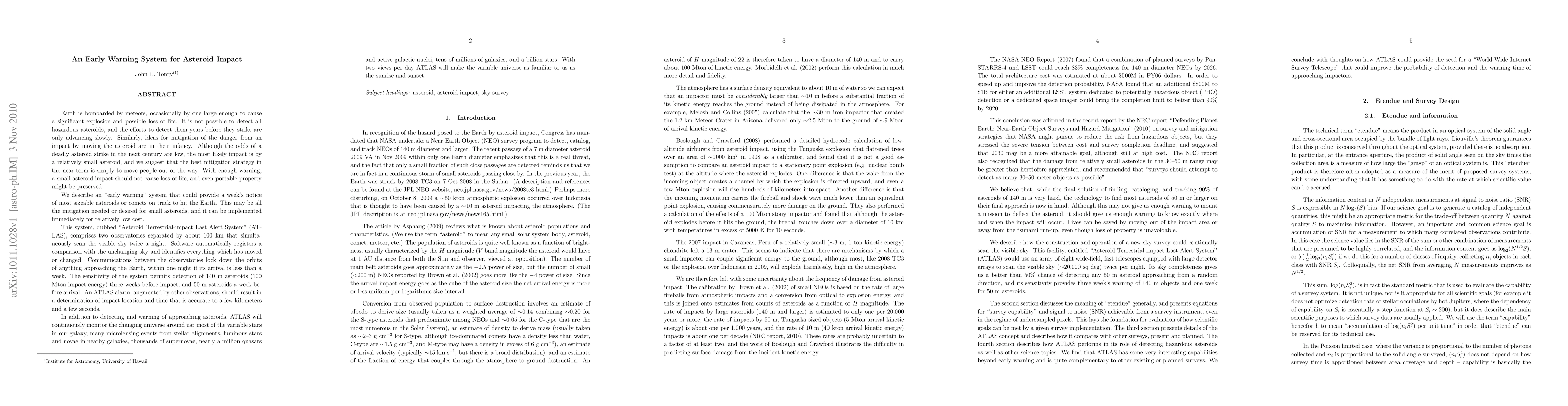A new early warning system called Asteroid Terrestrial-impact Last Alert System (ATLAS) can detect sizable asteroids with a week's notice, providing crucial time for evacuation, and will also monitor the universe for variable stars, supernovae, and other celestial events.