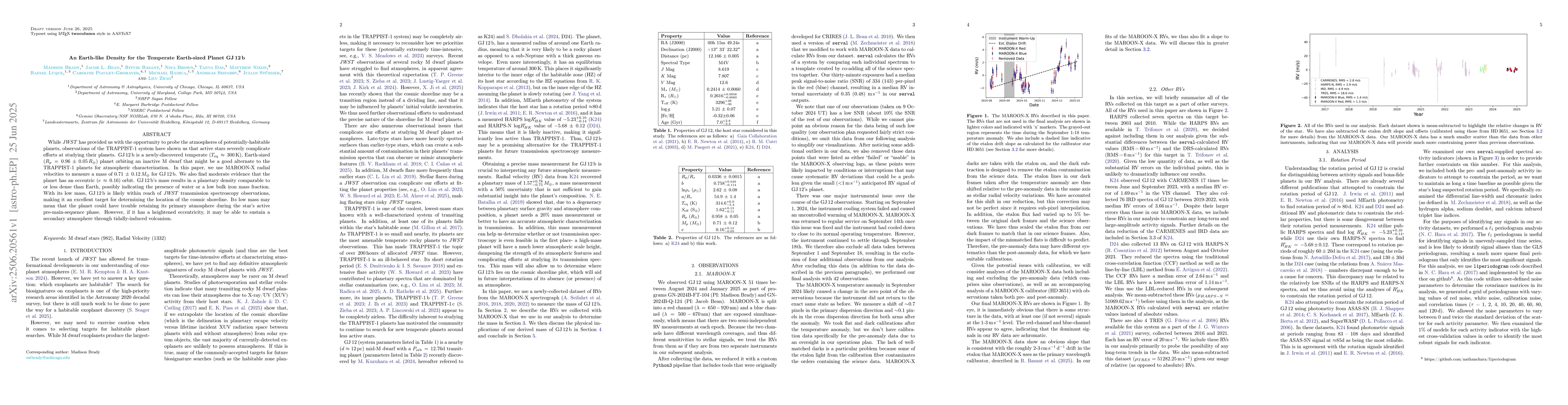 While JWST has provided us with the opportunity to probe the atmospheres of potentially-habitable planets, observations of the TRAPPIST-1 system have shown us that active stars severely complicate efforts at studying their planets. GJ 12b is a newly-discovered temperate (Teq ~ 300 K), Earth-sized (Rp = 0.96 +/- 0.05 Earth radii) planet orbiting an inactive M dwarf that might be a good alternate to the TRAPPIST-1 planets for atmospheric characterization. In this paper, we use MAROON-X radial velocities to measure a mass of 0.71 +/- 0.12 Earth masses for GJ 12b. We also find moderate evidence that the planet has an eccentric (e ~ 0.16) orbit. GJ 12b's mass results in a planetary density comparable to or less dense than Earth, possibly indicating the presence of water or a low bulk iron mass fraction. With its low mass, GJ 12b is likely within reach of JWST transmission spectroscopy observations, making it an excellent target for determining the location of the cosmic shoreline. Its low mass may mean that the planet could have trouble retaining its primary atmosphere during the star's active pre-main-sequence phase. However, if it has a heightened eccentricity, it may be able to sustain a secondary atmosphere through tidally-induced volcanism.
