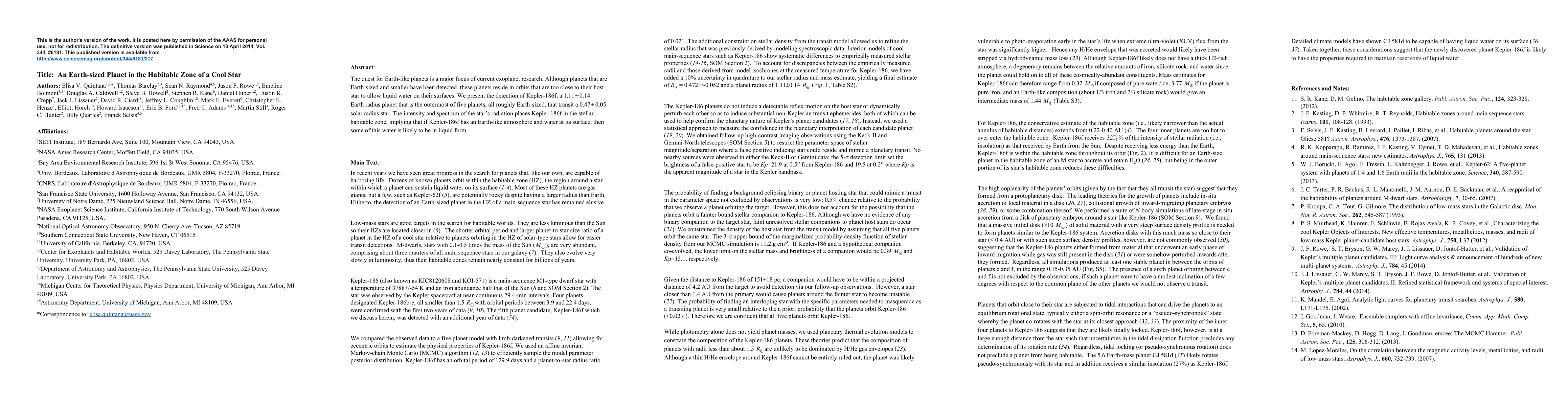 This paper reports the discovery of Kepler-186f, an Earth-sized planet located in the habitable zone of a cool star, suggesting potential for liquid water on its surface if it has an Earth-like atmosphere and water. This discovery marks a significant step in the search for potentially habitable Earth-like planets.