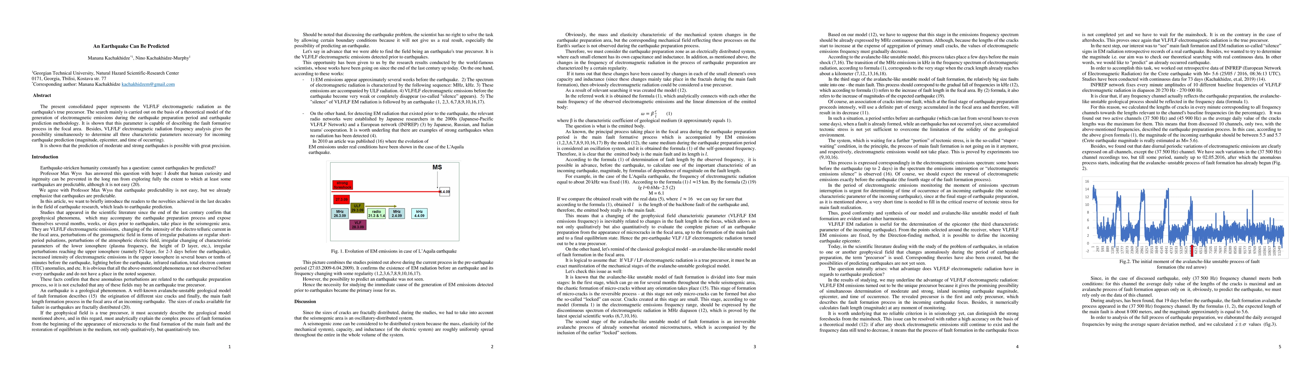 The paper represents the VLF/LF electromagnetic radiation as the earthquake's true precursor. It is shown that this parameter is capable of describing the fault formative process in the focal area. Besides, VLF/LF electromagnetic radiation frequency analysis gives the possibility simultaneously to determine all three characteristic parameters necessary for incoming earthquake prediction (magnitude, epicenter, and time of occurring). It is shown that the prediction of moderate and strong earthquakes is possible with great precision.