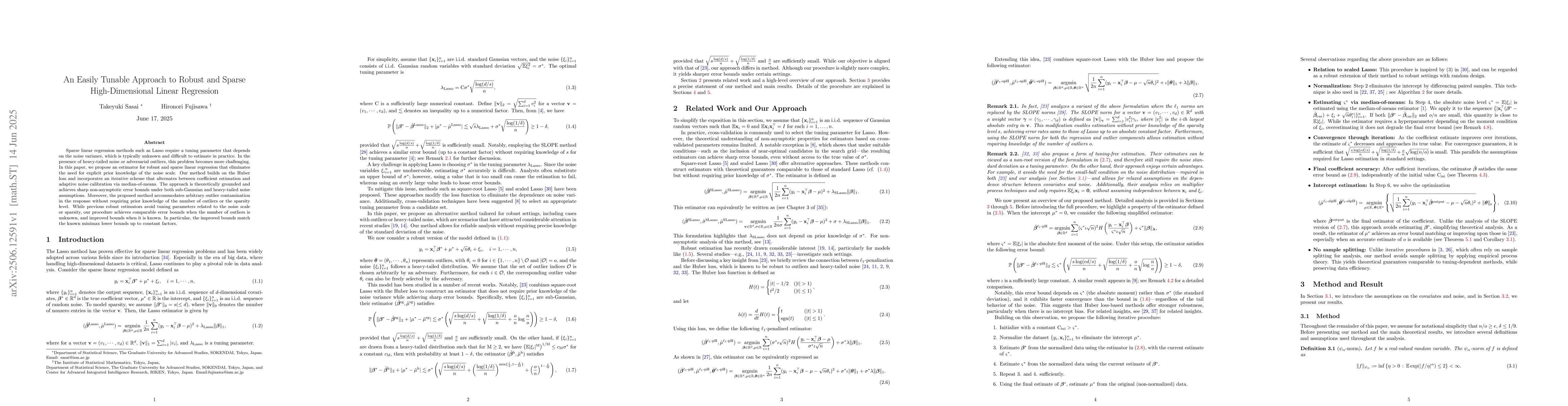 Sparse linear regression methods such as Lasso require a tuning parameter that depends on the noise variance, which is typically unknown and difficult to estimate in practice. In the presence of heavy-tailed noise or adversarial outliers, this problem becomes more challenging. In this paper, we propose an estimator for robust and sparse linear regression that eliminates the need for explicit prior knowledge of the noise scale. Our method builds on the Huber loss and incorporates an iterative scheme that alternates between coefficient estimation and adaptive noise calibration via median-of-means. The approach is theoretically grounded and achieves sharp non-asymptotic error bounds under both sub-Gaussian and heavy-tailed noise assumptions. Moreover, the proposed method accommodates arbitrary outlier contamination in the response without requiring prior knowledge of the number of outliers or the sparsity level. While previous robust estimators avoid tuning parameters related to the noise scale or sparsity, our procedure achieves comparable error bounds when the number of outliers is unknown, and improved bounds when it is known. In particular, the improved bounds match the known minimax lower bounds up to constant factors.