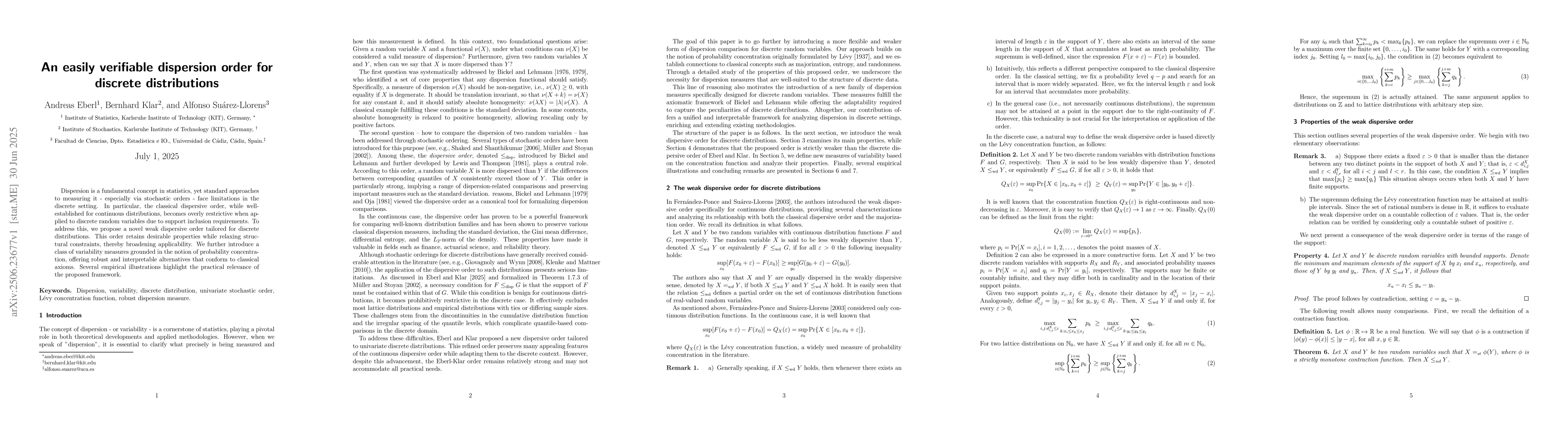 Dispersion is a fundamental concept in statistics, yet standard approaches to measuring it - especially via stochastic orders - face limitations in the discrete setting. In particular, the classical dispersive order, while well-established for continuous distributions, becomes overly restrictive when applied to discrete random variables due to support inclusion requirements. To address this, we propose a novel weak dispersive order tailored for discrete distributions. This order retains desirable properties while relaxing structural constraints, thereby broadening applicability. We further introduce a class of variability measures grounded in the notion of probability concentration, offering robust and interpretable alternatives that conform to classical axioms. Several empirical illustrations highlight the practical relevance of the proposed framework.