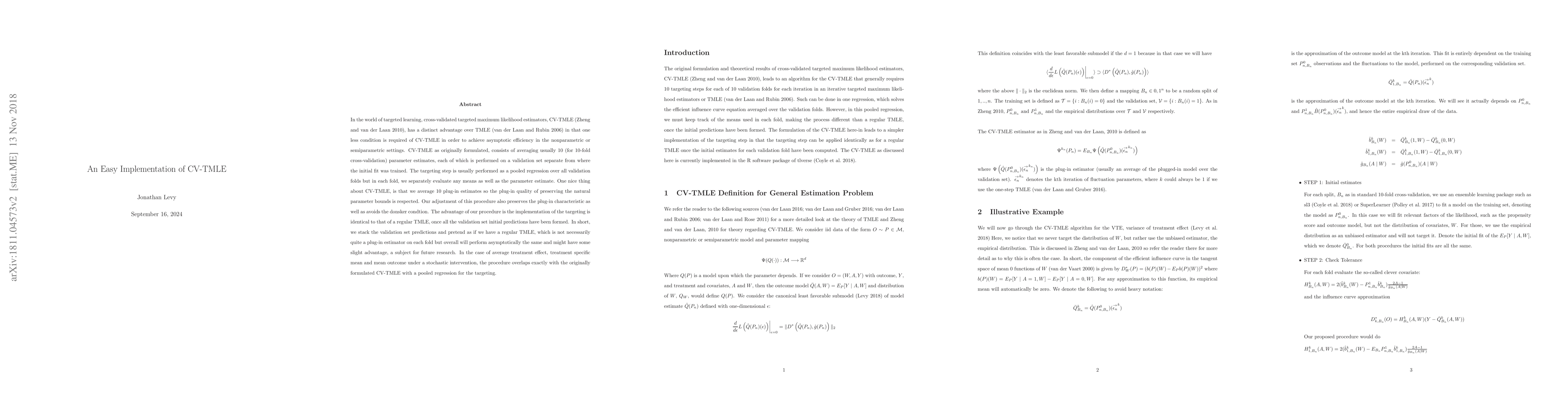 In the world of targeted learning, cross-validated targeted maximum likelihood estimators, CV-TMLE [Zheng:2010aa], has a distinct advantage over TMLE [Laan:2006aa] in that one less condition is required of CV-TMLE in order to achieve asymptotic efficiency in the nonparametric or semiparametric settings. CV-TMLE as originally formulated, consists of averaging usually 10 (for 10-fold cross-validation) parameter estimates, each of which is performed on a validation set separate from where the initial fit was trained. The targeting step is usually performed as a pooled regression over all validation folds but in each fold, we separately evaluate any means as well as the parameter estimate. One nice thing about CV-TMLE, is that we average 10 plug-in estimates so the plug-in quality of preserving the natural parameter bounds is respected. Our adjustment of this procedure also preserves the plug-in characteristic as well as avoids the donsker condtion. The advantage of our procedure is the implementation of the targeting is identical to that of a regular TMLE, once all the validation set initial predictions have been formed. In short, we stack the validation set predictions and pretend as if we have a regular TMLE, which is not necessarily quite a plug-in estimator on each fold but overall will perform asymptotically the same and might have some slight advantage, a subject for future research. In the case of average treatment effect, treatment specific mean and mean outcome under a stochastic intervention, the procedure overlaps exactly with the originally formulated CV-TMLE with a pooled regression for the targeting.