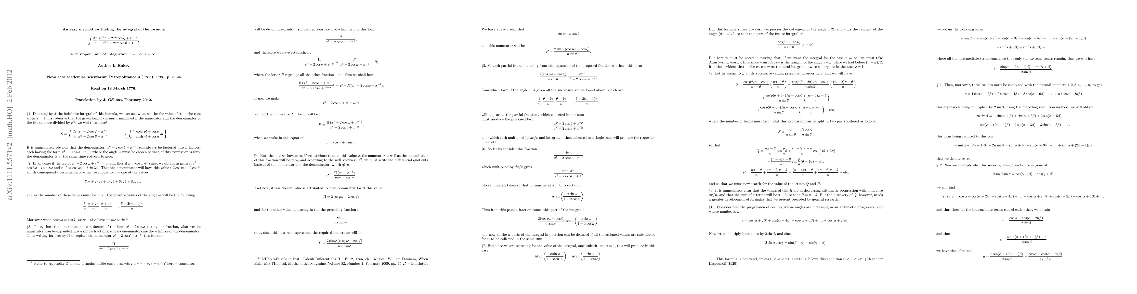 This is a translation of an article presented by Leonhard Euler on 18 March 1776 (Opera Omnia I-XVIII, pp. 265-290) and of summaries for it by Sim\'eon Denis Poisson in 1820 and by Heinrich Burkhardt in 1916. An appendix lists in modern notation interesting definite integrals and series which Euler, after using partial fractions to prove his main formula, obtained formally by allowing the parameters $n, p, zeta and theta$ to take particular, even pure imaginary, values : the Fourier cosine and two-sided Laplace transforms of the trigonometric and of the hyperbolic secant (also squared), and their partial fraction decomposition. The source archive provides, in Plain TeX, LaTeX and PDF formats, the corrected Latin text and a complete translation into French.